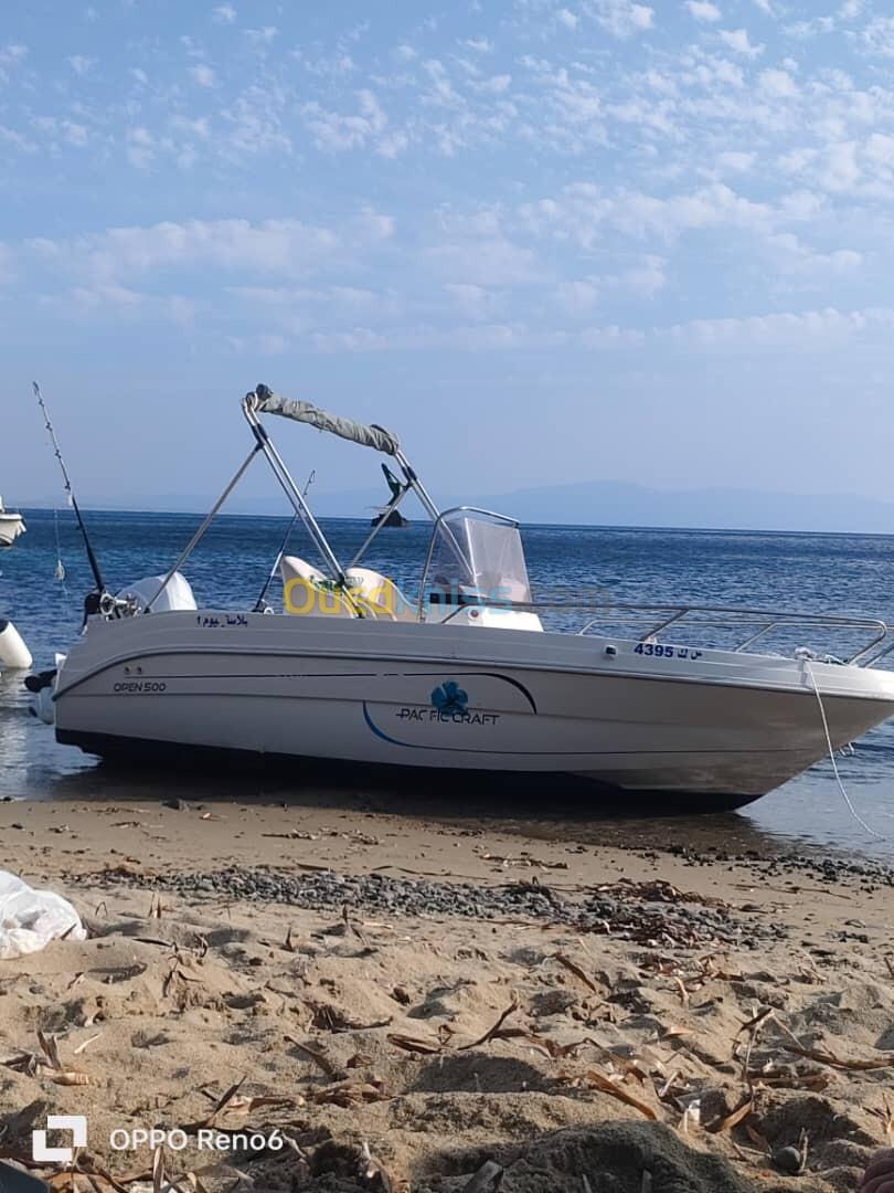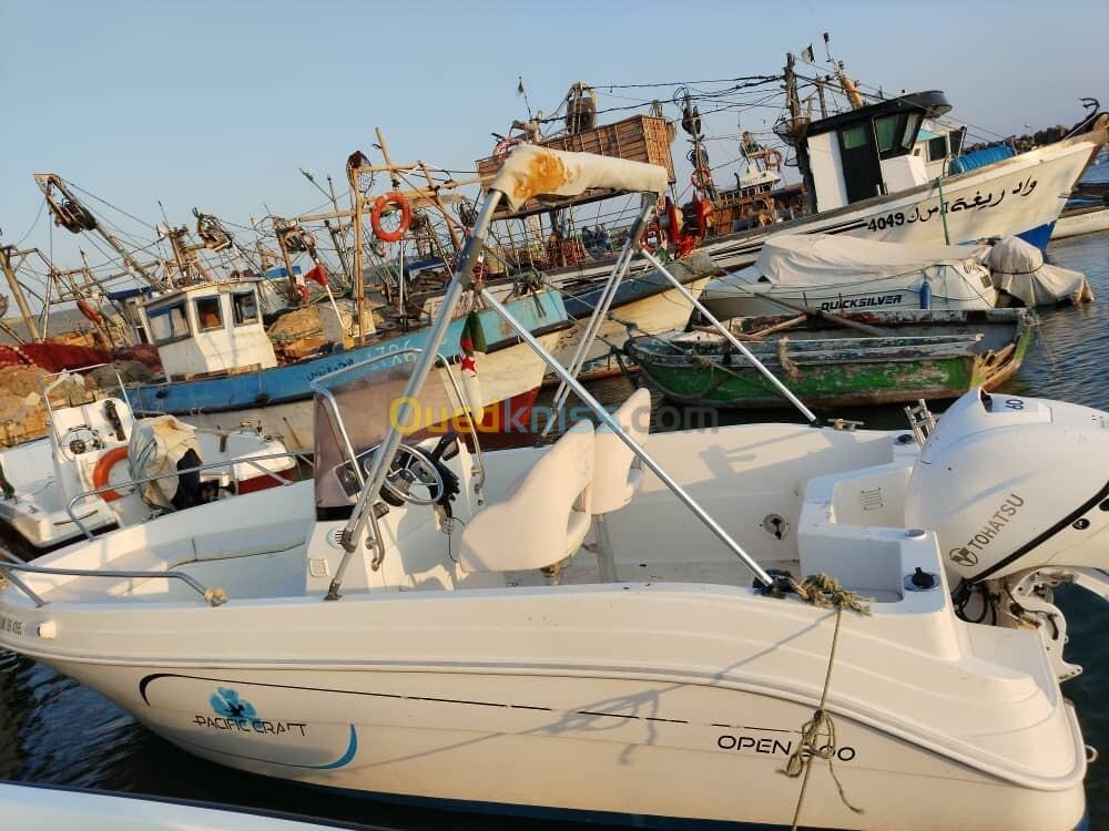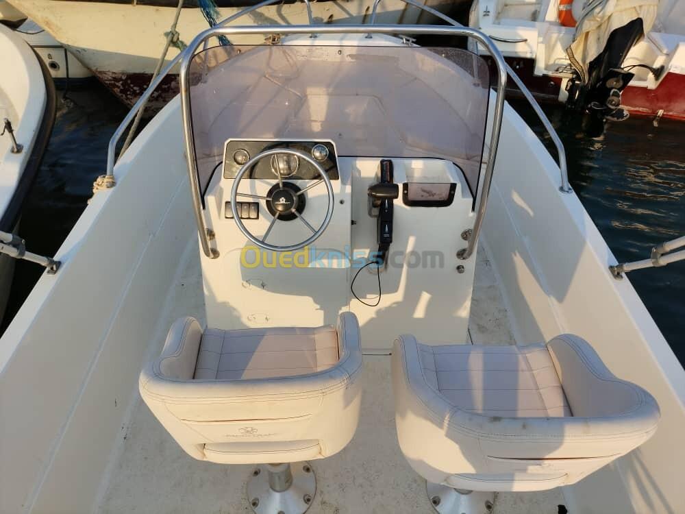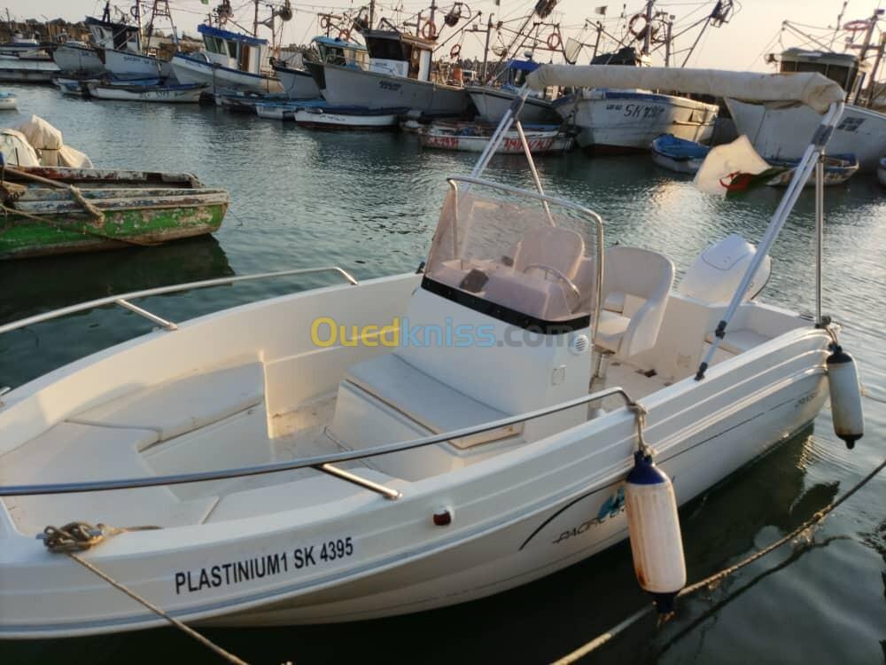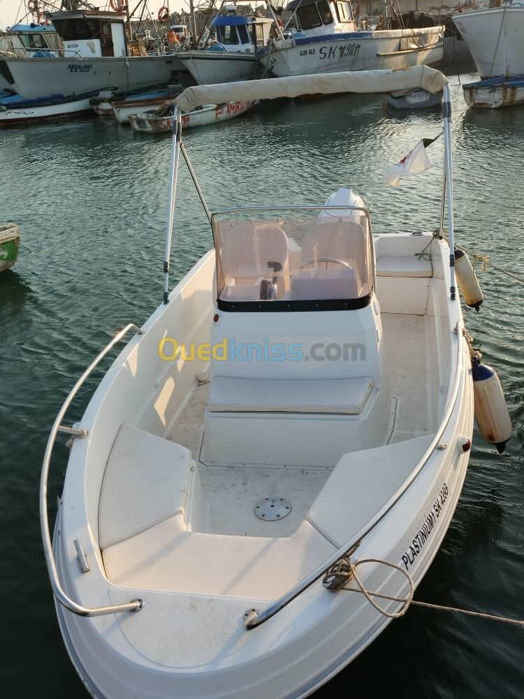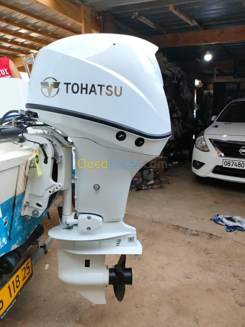 Hors bord français avec plusieurs option : bimini, réservoir 45 litres, balcon, klaxon, échelle inox, sondeur Lawrence Hook 5. Moteur tohatsu 60 4 temps