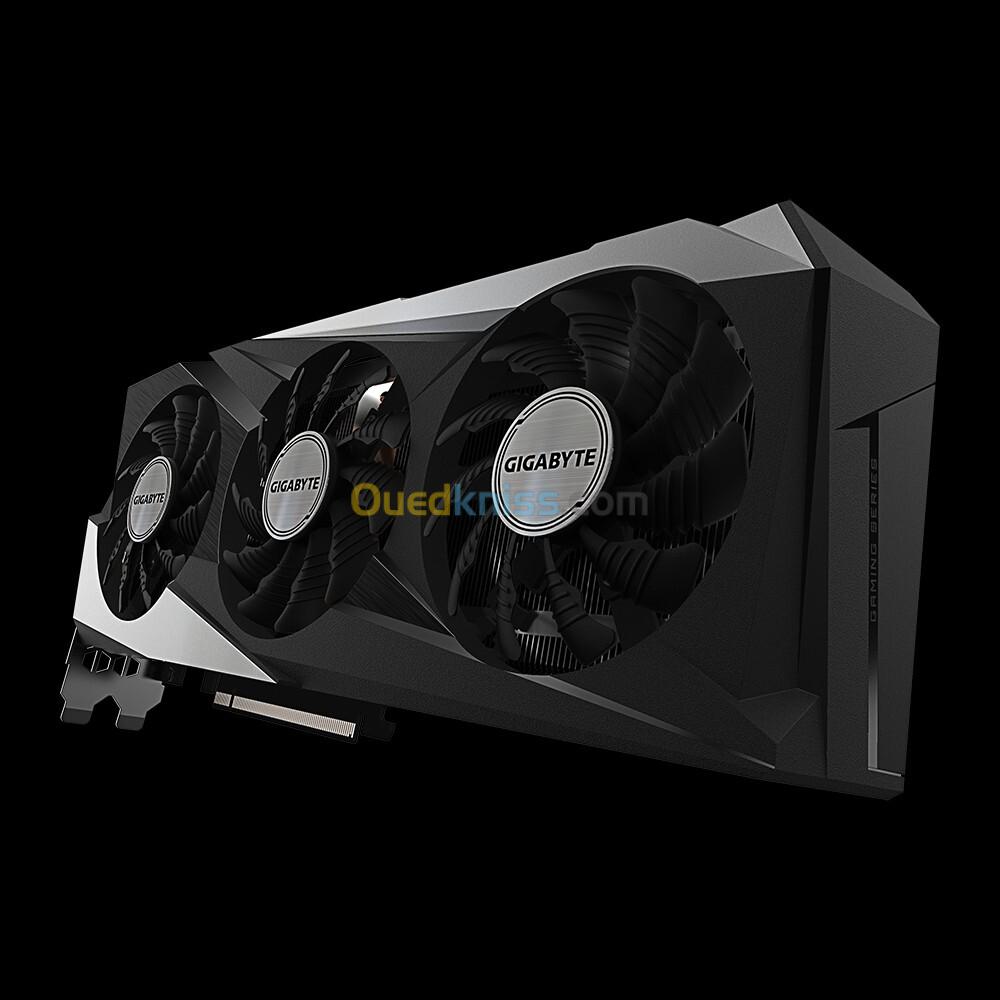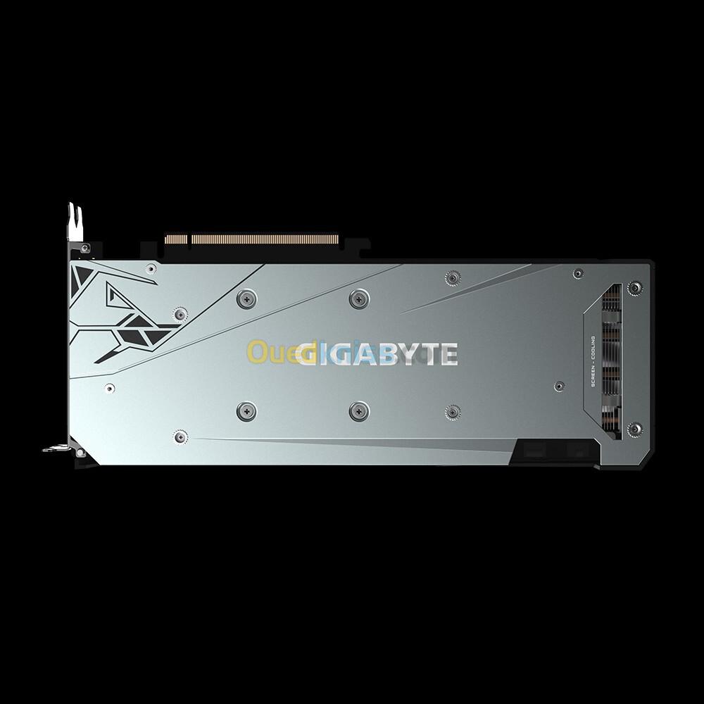 La Gigabyte Radeon RX 6700 XT GAMING OC 12G est une carte graphique basée sur l’architecture AMD RDNA 2, dotée de 12 Go de mémoire GDDR6 192 bits, avec un Boost Clock jusqu’à 2622 MHz et un Game Clock jusqu’à 2514 MHz, idéale pour le jeu en 1440p. Elle intègre le système de refroidissement WINDFORCE 3X avec trois ventilateurs à rotation alternée, caloducs en cuivre Direct Touch, refroidissement semi-passif 3D Active Fan et dissipateur Screen Cooling, ainsi qu’un nano-lubrifiant au graphène pour prolonger la durée de vie des ventilateurs. Elle dispose d’une plaque arrière métallique, d’un éclairage RGB Fusion 2.0 personnalisable, et prend en charge DirectX 12 Ultimate, Raytracing, AMD FidelityFX, FreeSync, Smart Access Memory, et HDMI 2.1 VRR, avec une connectique comprenant 3 DisplayPort 1.4a et 1 HDMI 2.1.