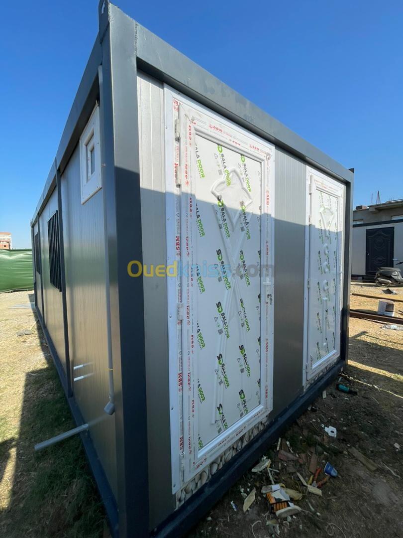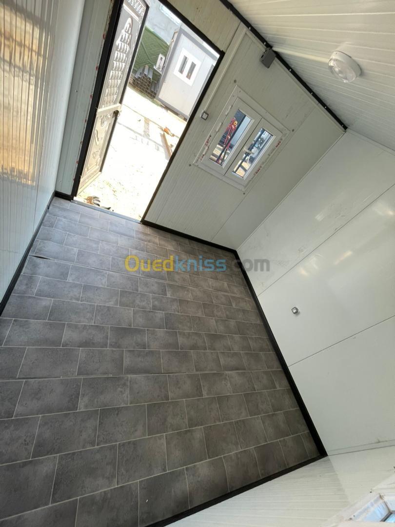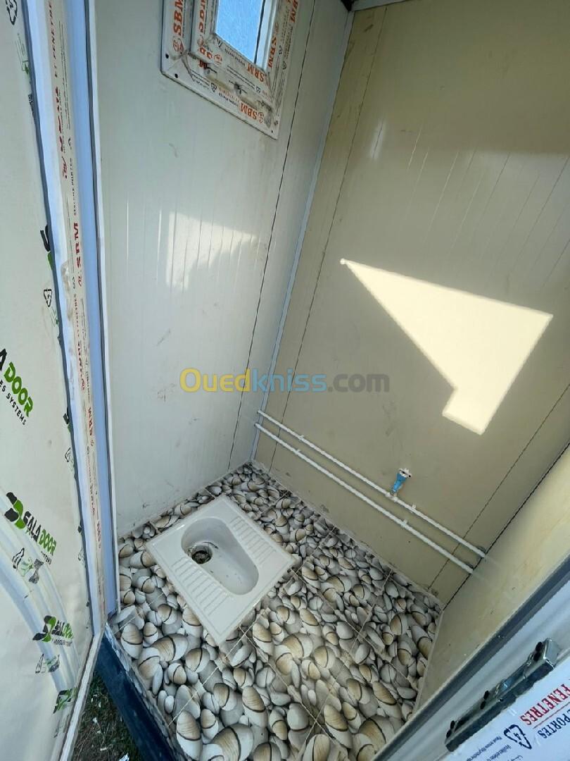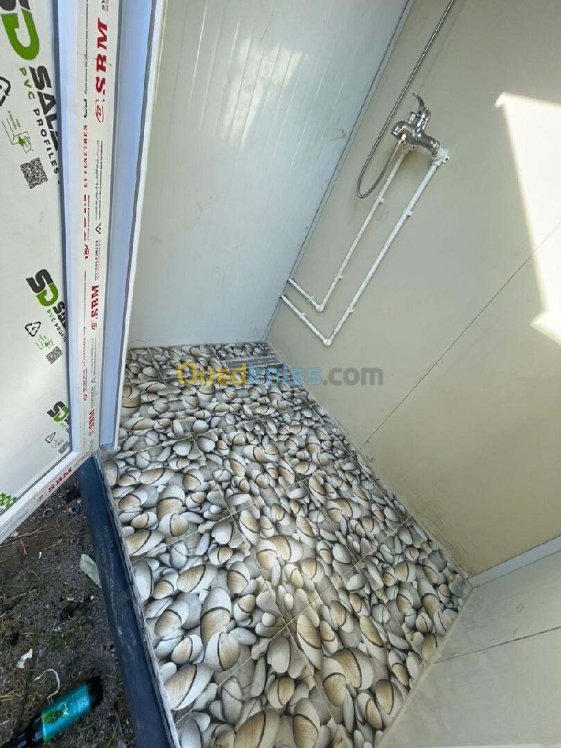 Panneau sandwich 40mm Structure métallique tube carré 90mm Porte métallique et pvc fenêtre en pvc avec barreaudage Gerflex Wc turque + lavabo et robinet + douchette et douche Le revêtement de sol en dalle de sol en sanitaires Installation électrique et plomberie Gouttière en pvc Couleur au choix