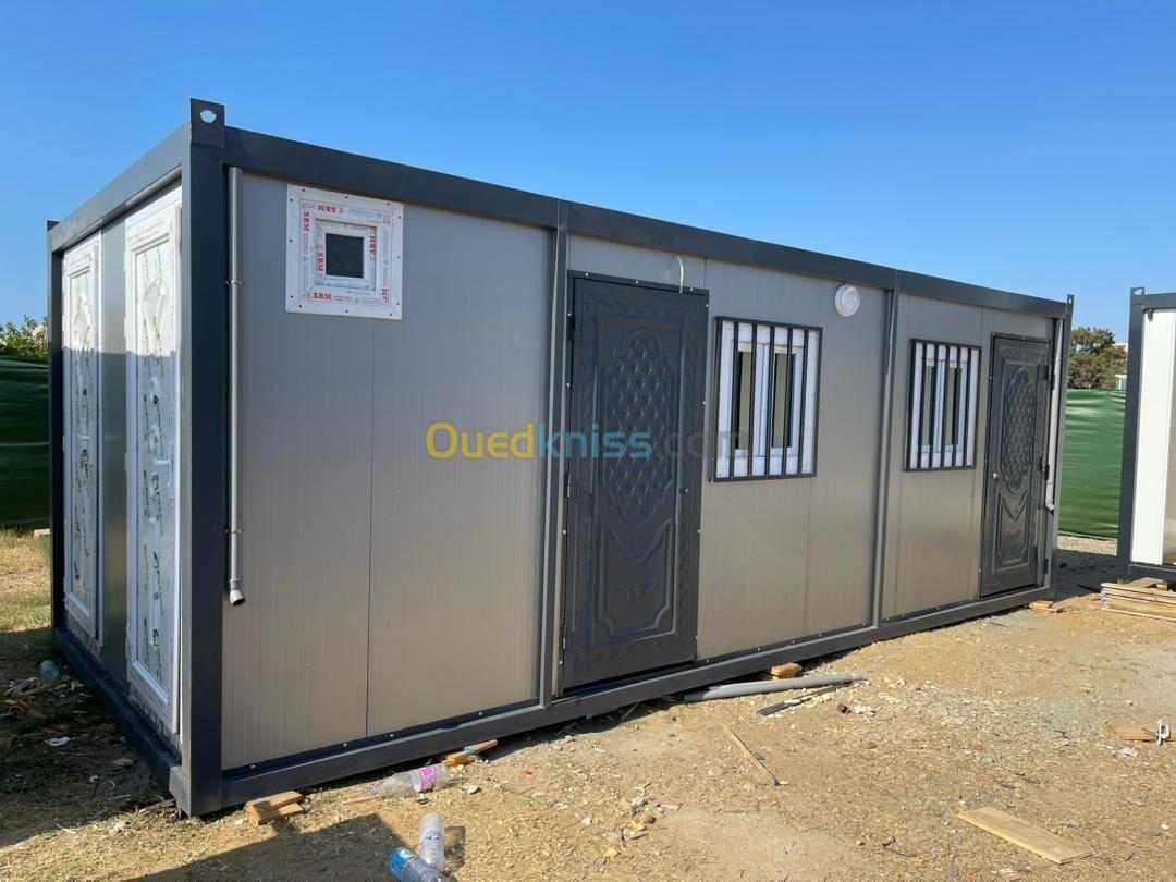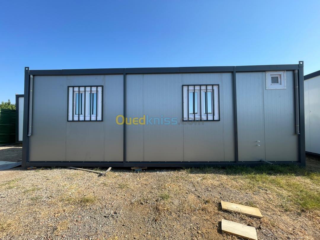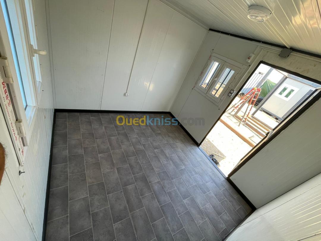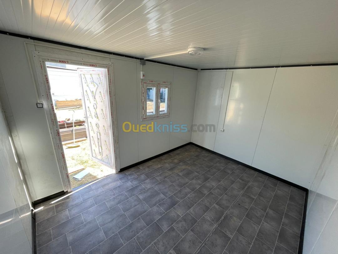 Panneau sandwich 40mm Structure métallique tube carré 90mm Porte métallique et pvc fenêtre en pvc avec barreaudage Gerflex Wc turque + lavabo et robinet + douchette et douche Le revêtement de sol en dalle de sol en sanitaires Installation électrique et plomberie Gouttière en pvc Couleur au choix