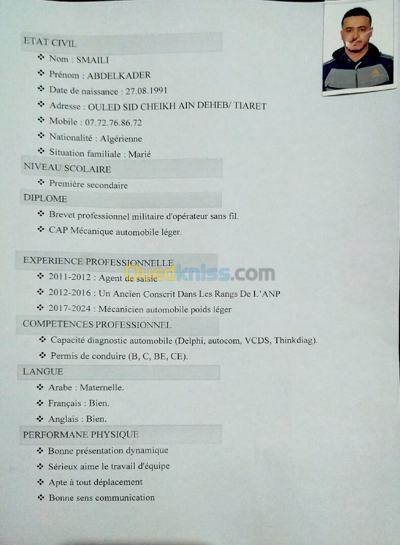 ميكانيكي مؤهل بكفاءة خبرة اكثر من 12 سنة و مازلت في ورشتي الخاصة في مجال ميكانيك وعامة تصليح