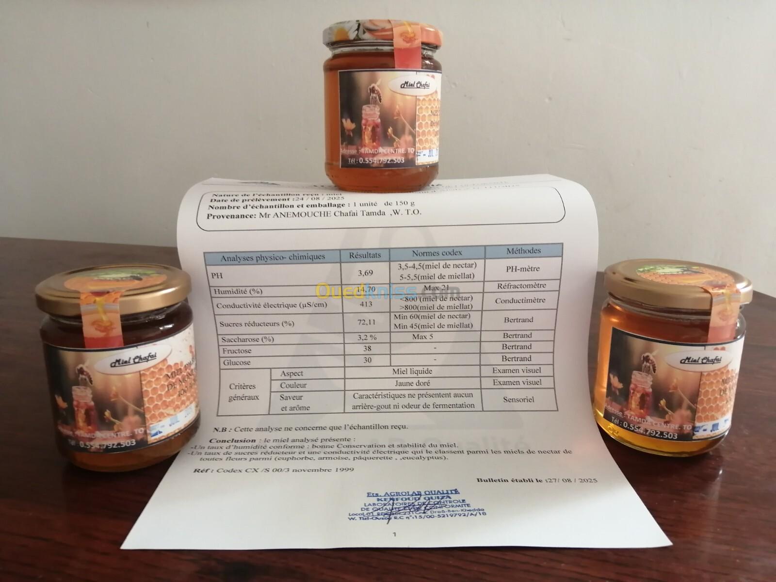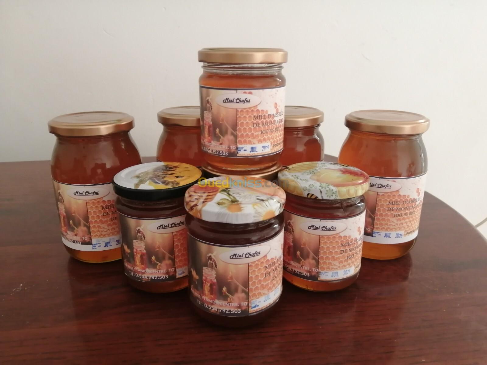 Découvrez la véritable saveur et la qualité du miel pur de mes ruches récolté avec attention et approuvé par le bulletin d'analyses physico-chimiques . - Miel d'abeille de toutes fleurs de montagne.(Romarin et le thym...) (كل الأزهار الجبلية بما فيها اكليل الجبل و الزعيترة) - Nous avons aussi le Miel d'abeille d'euphorbe (عسل اللبينة). Profitez de la livraison gratuite sur tizi ouzou. Disponible en pots de : - 250grs - 500grs - 1kg Disponible en gros. ## Stock limité ##
