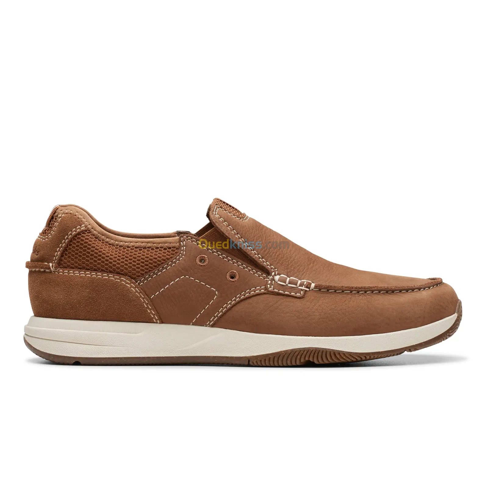 • Tige en nubuck beige clair durable • Profil à enfiler avec élasticité ajoutée offrant un ajustement sécurisé et un enfilage/désenfilage facile • Semelle extérieure antidérapante avec rainures offrant une traction dans des conditions humides