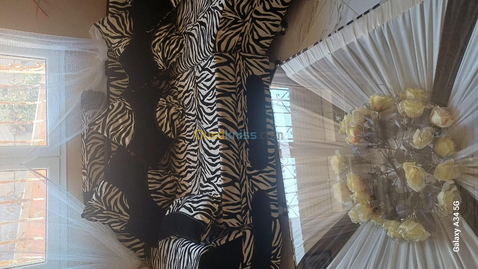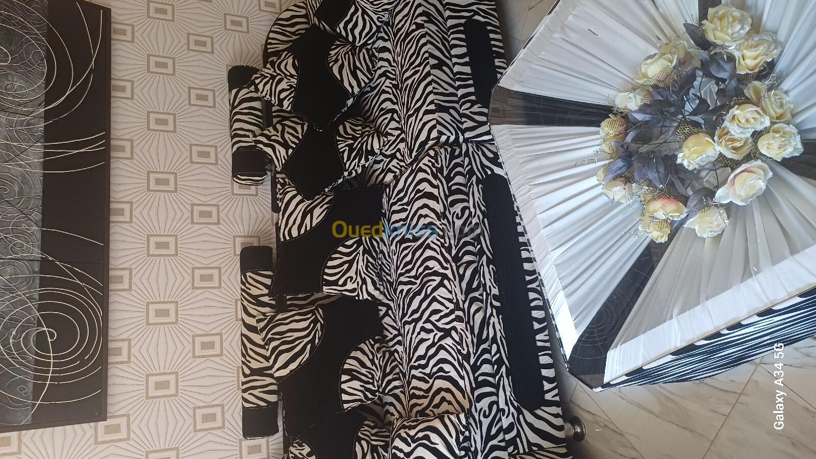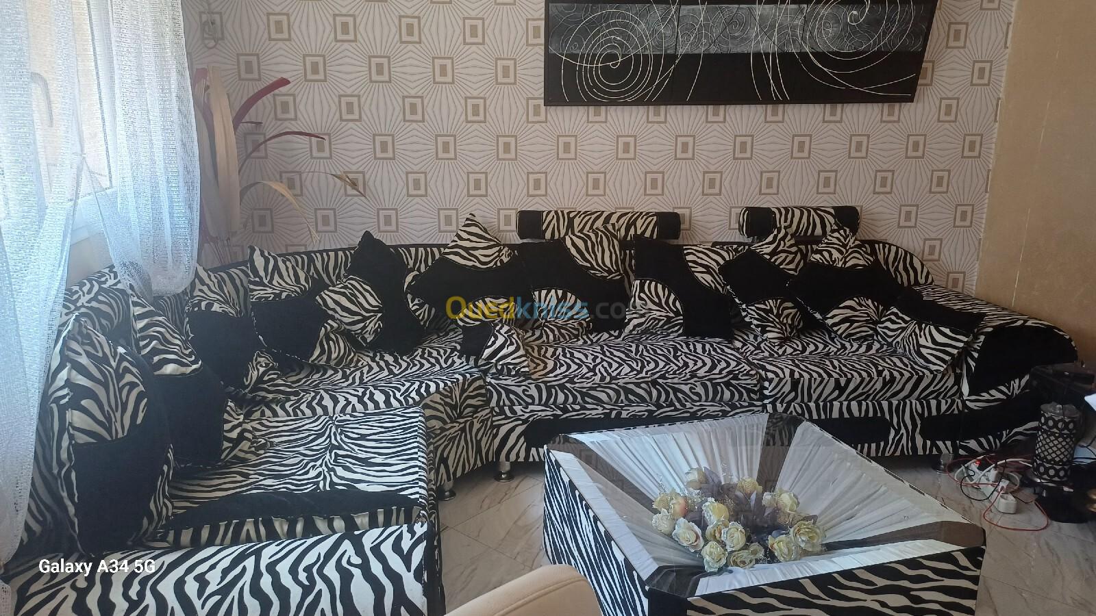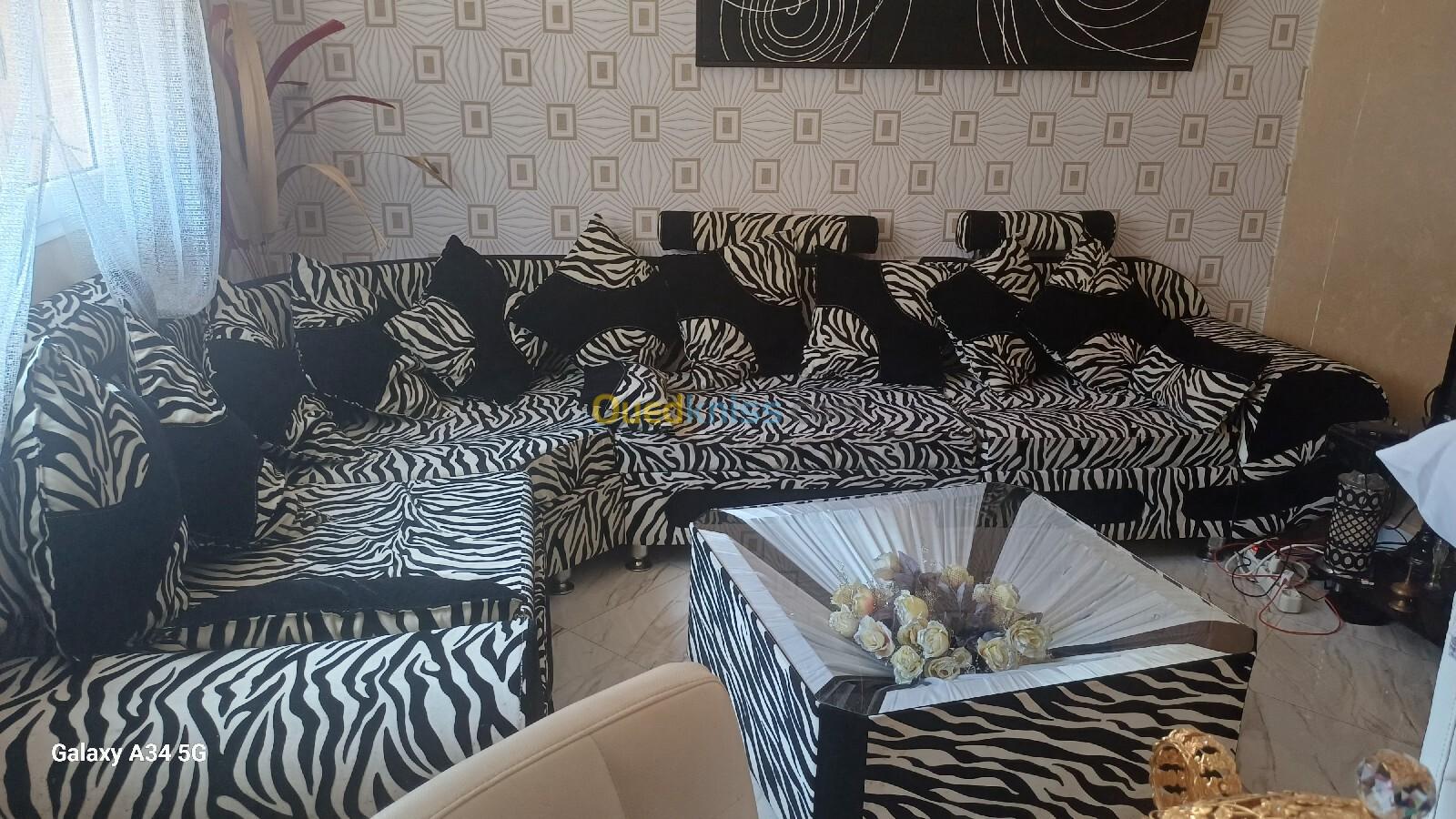 Salon d'angle décoratif zèbre bon état général avec sa table basse.
