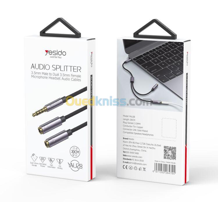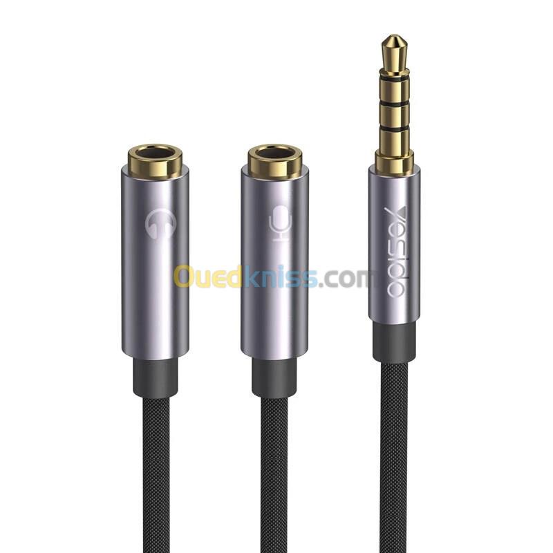 YESIDO YAU28 Adaptateur Audio Séparateur AUX 3.5mm Male Vers Double AUX Femelle Microphone et Casque