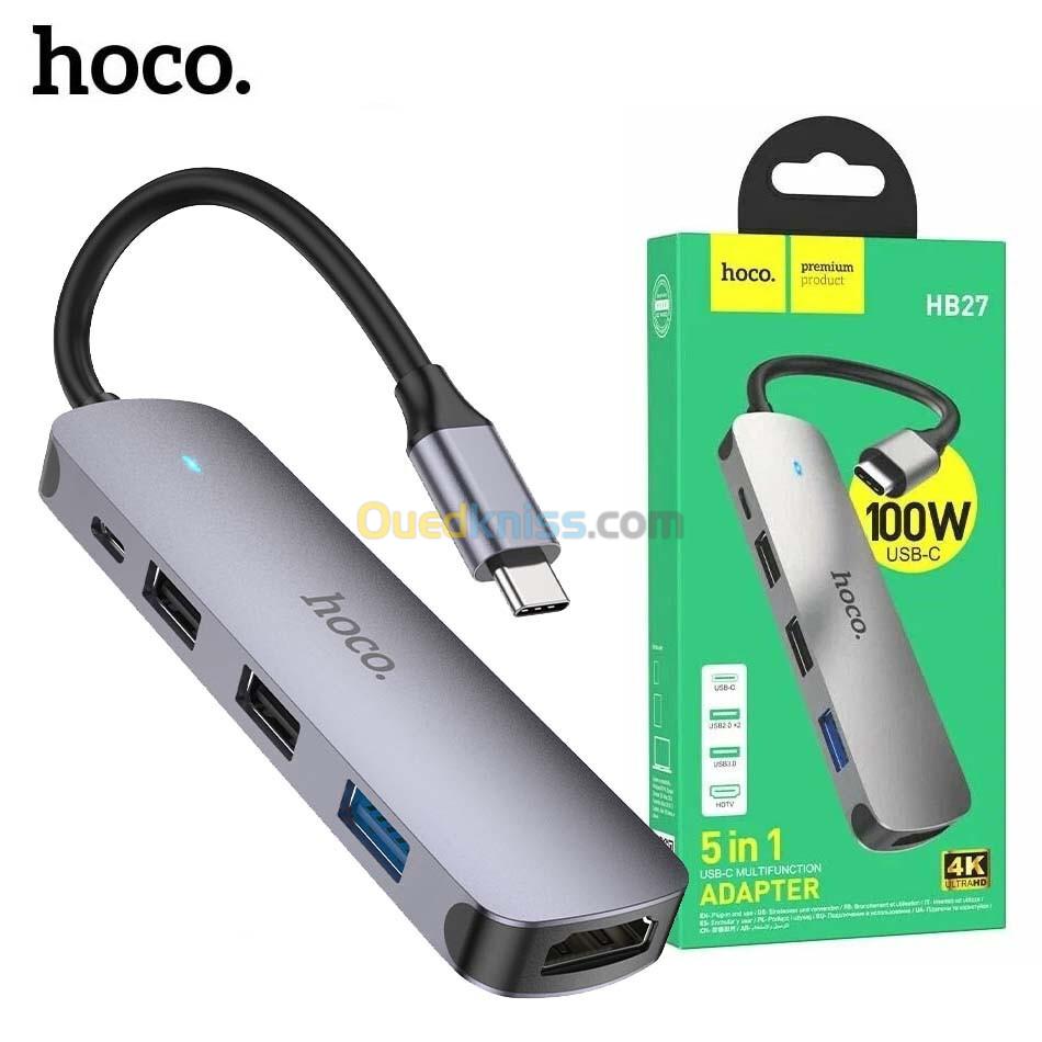 ➡️➡️ التوصيل إلى 58 ولاية الدفع عند الاستلام ➡️➡️ Livraison 58 wilayas Paiement à la livraison ➡️➡️ البيع فقط عن طريق التوصيل ،للطلب اضغط على زر "طلب" ➡️➡️ ➡️➡️ Vente uniquement par livraison, Pour commander appuyez sur le bouton "Commander" ➡️➡️ ➡️➡️ لأية أسئلة أو معلومات أرسل لنا رسالة ➡️➡️ ➡️➡️ Pour toutes questions ou informations envoyez-nous un message ➡️➡️ Élevez votre espace de connexion avec le hub multi-fonction HOCO HB27 100 W, conçu pour transformer un unique port USB-C en véritable station de travail. Compact et élégant, il permet de connecter un écran HDMI 4K 30Hz, des clés USB, un ordinateur ou un smartphone compatible OTG, tout en assurant la recharge de vos appareils grâce à la fonction Power Delivery. Exactement ce qu’il vous faut pour un bureau minimal, un voyage ou une installation mobile.Élevez votre espace de connexion avec le hub multi-fonction HOCO HB27 100 W, conçu pour transformer un unique port USB-C en véritable station de travail. Compact et élégant, il permet de connecter un écran HDMI 4K 30Hz, des clés USB, un ordinateur ou un smartphone compatible OTG, tout en assurant la recharge de vos appareils grâce à la fonction Power Delivery. Exactement ce qu’il vous faut pour un bureau minimal, un voyage ou une installation mobile. Caractéristiques : • Design en alliage d’aluminium et ABS offrant résistance et élégance. • Format compact et léger, idéal pour le transport quotidien. • Permet de connecter un écran externe jusqu’en résolution 4K à 30Hz. • Fonction Power Delivery jusqu’à 60W pour recharger ordinateur ou tablette. • Connectique complète : HDMI, USB 3.0, deux USB 2.0, et port USB-C PD. • Compatible avec Windows, macOS, et appareils mobiles dotés d’un port USB-C. • Prise en charge OTG pour smartphones et tablettes compatibles. • Parfait pour créer une station de travail portable ou un setup minimaliste. Spécifications : • Matériau : alliage d’aluminium + ABS • Ports disponibles : • 1 × HDMI (résolution jusqu’à 4K @ 30Hz) • 1 × USB 3.0 Type-A • 2 × USB 2.0 Type-A • 1 × USB-C Power Delivery (jusqu’à 60 W) • Dimensions : 109 × 28,8 × 11,6 mm • Longueur du câble : environ 135 mm • Poids : environ 43 g • Compatibilité : ordinateurs portables, tablettes, smartphones USB-C • Fonctions supportées : transfert de données, affichage HDMI, recharge simultanée