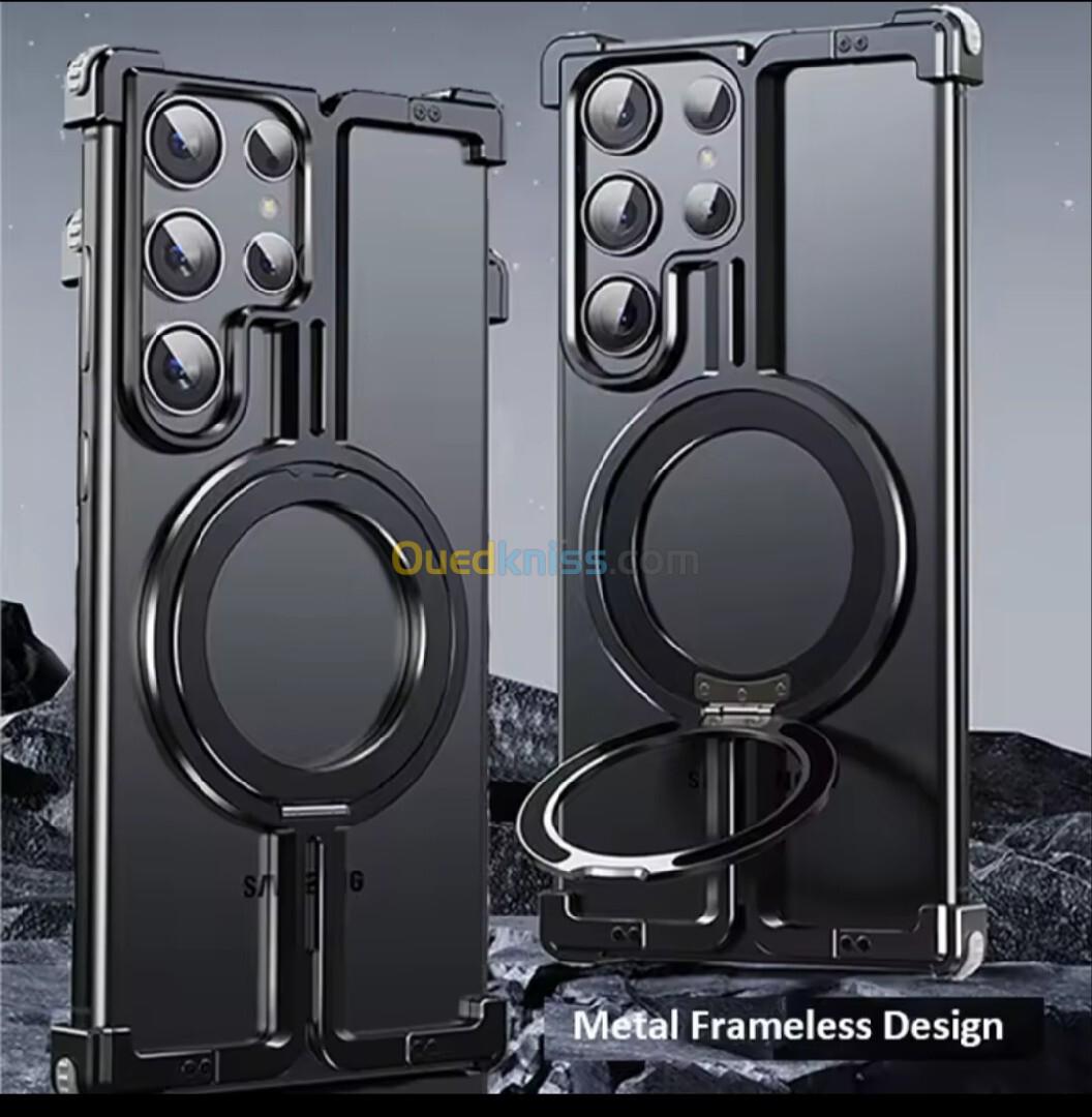 Coque de protection métallique avec support magnétique intégré pour Samsung S24/S25 Ultra. Son design robuste assure une protection optimale contre les chocs et les rayures, tout en maintenant un profil élégant et léger. Le support magnétique intégré permet une utilisation pratique en mode mains libres, idéal pour le visionnage de vidéos ou l'utilisation en voiture. La structure ouverte garantit un accès facile aux boutons et aux ports, tout en conservant la dissipation thermique du téléphone. Facile à installer et compatible avec la recharge sans fil