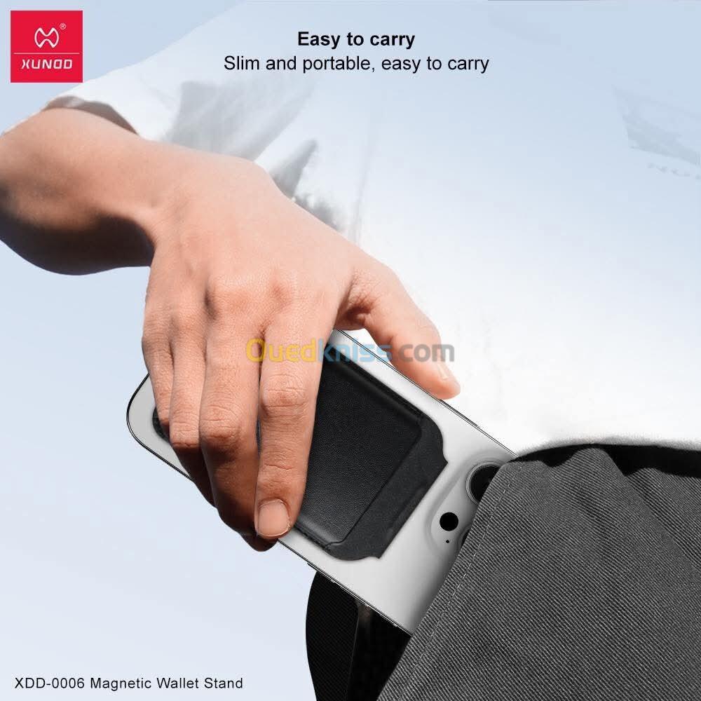 Le porte-cartes XUNDD XDD-0006 est un accessoire élégant et multifonction conçu spécialement pour les iPhones compatibles MagSafe. Fabriqué en cuir véritable de haute qualité, il offre une sensation douce au toucher et une finition soignée, idéale pour un usage quotidien. Grâce à son système magnétique puissant intégré avec 10 aimants en néodyme N52 (intensité entre 1800 et 2000 Gauss), il s'attache fermement à l’arrière du téléphone, assurant une fixation sécurisée sans risque de glisser. Il permet de transporter facilement vos cartes essentielles tout en les maintenant bien en place grâce à un système anti-chute interne. Pratique et intelligent, ce porte-cartes se transforme également en support ajustable multi-angles. Il vous permet ainsi de positionner votre smartphone en mode portrait ou paysage pour regarder confortablement vos vidéos ou passer des appels en visio, sans avoir besoin d’accessoire supplémentaire. Compact, fin et léger, le XUNDD XDD-0006 combine style, praticité et fonctionnalité, tout en restant discret et facile à transporter. Un choix idéal pour ceux qui souhaitent allier élégance et efficacité au quotidien.