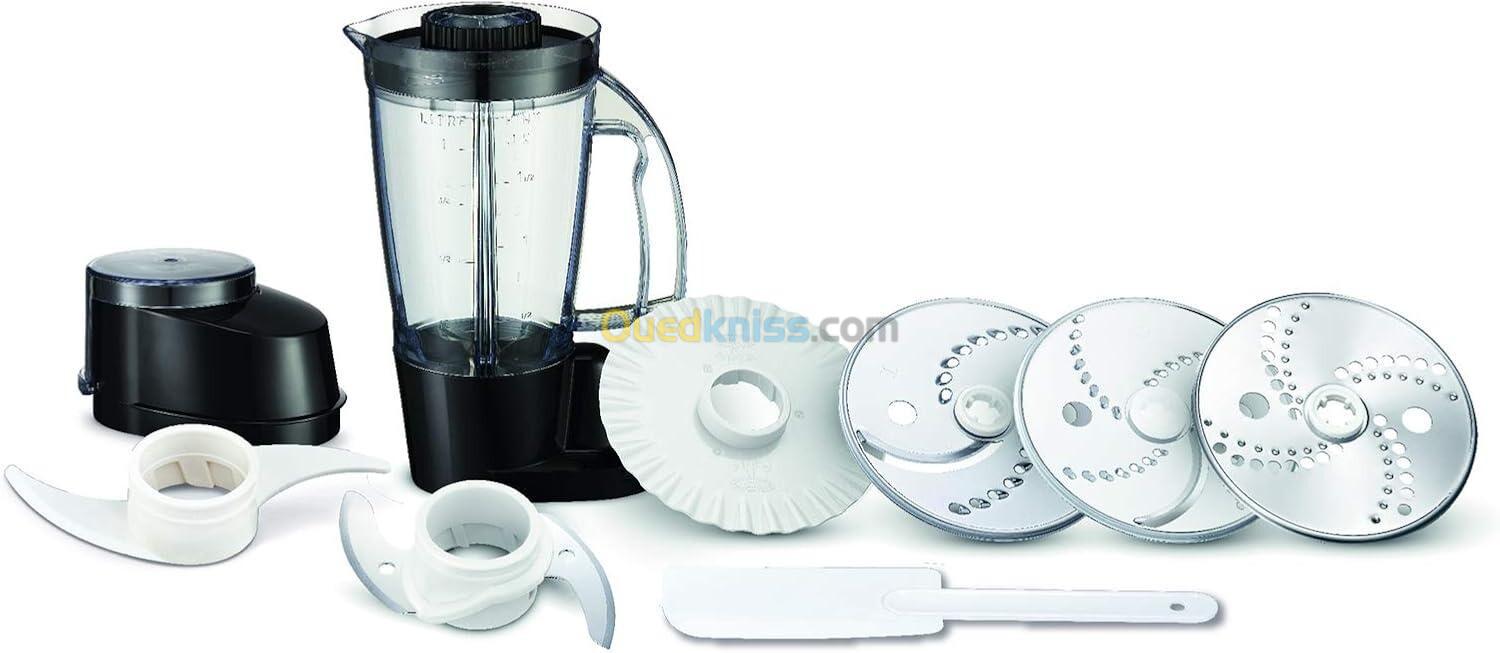 -9 ACCESSOIRES : pour réaliser toutes vos préparations culinaires. Bol 3L avec couteau hachoir, blender 1,25L, mini hachoir, 3 disques pour râper trancher (fin et épais), disque émulsionneur, pétrin, spatule et boite de rangement.