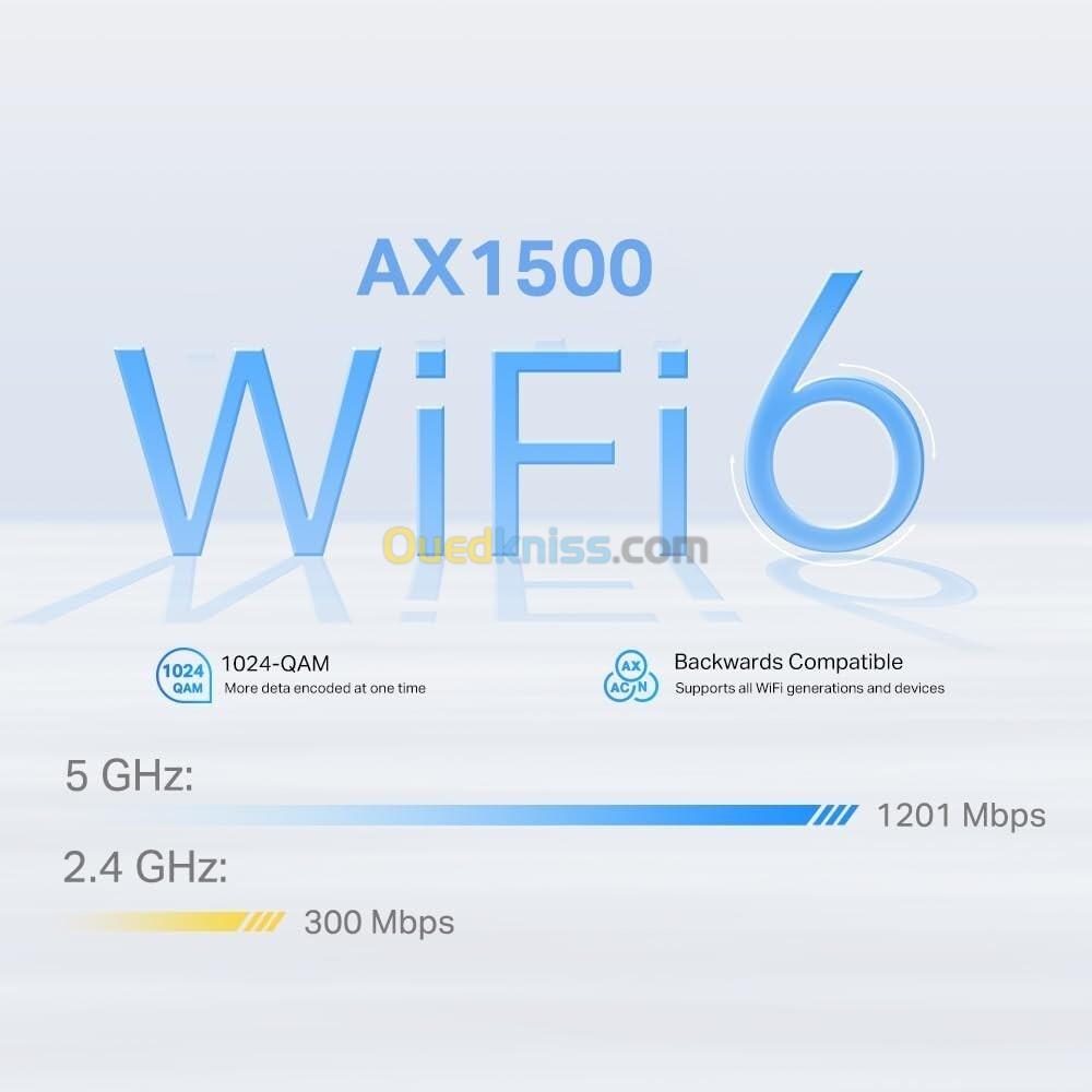 ► Wi-Fi double bande AX1500 – Wi-Fi double bande 1 201 Mbps (5 GHz) et 300 Mbps (2,4 GHz) avec technologie WiFi 6.