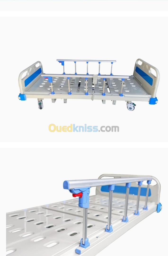 -Fabriqué en tubes d’acier rectangulaire 30 x 60 mm et en tôle métallique, composé d’un dossier et plicature de genoux articulés par deux manivelles multi-positions, hauteur variable réglable par manivelle, montants ABS, barrières de sécurité en aluminium rabattables; une potence; doté de quatre roues à frein ABS de diamètre 125 mm. Peinture « époxy ».