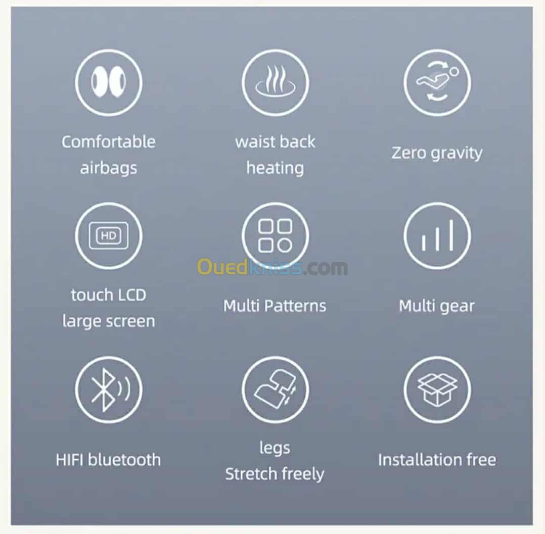 8 rouleaux fixes pour le dossier, le dos et la taille .De plus, 2 rouleaux fixes pour les hanches, 2 pièces chauffantes près de la taille peuvent aider à soulager l’inconfort lombaire.