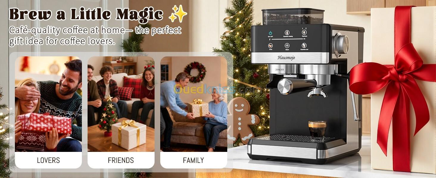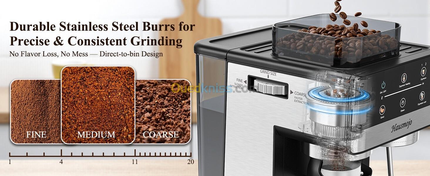 💜 مطحنة مدمجة - نضارة مضمونة من الحبة إلى الكوب: استمتع بنضارة مثالية من الحبة إلى الكوب مع ماكينة الإسبريسو هاوسموجو جريندبرو. مطحنة معدنية مخروطية مدمجة مع ٢٠ إعداد طحن دقيق تجعلها الأداة المثالية. يقلل نظام التغذية المباشرة من احتباس القهوة وخطر الانسداد، مما يضمن إسبرسو نقيًا، عطريًا، وغنيًا بالنكهة من أول كوب إلى آخره.