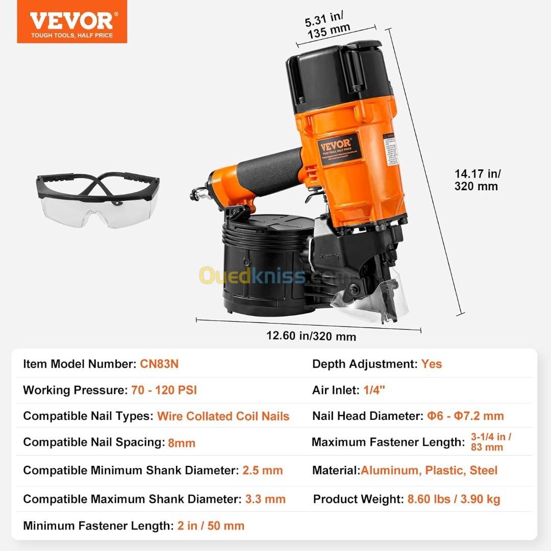 Compatible avec les compresseurs d'air de plus de 15 gallons et fonctionnant dans une plage de pression de 70 à 120 psi, ce pistolet à clous à bobine se distingue dans la réparation de tabourets en bois, de clôtures, de boîtes d'emballage et de tâches de construction générales telles que les pneus, la gaine et le poêle latéral. C'est un outil idéal pour les projets de bricolage professionnels et domestiques.