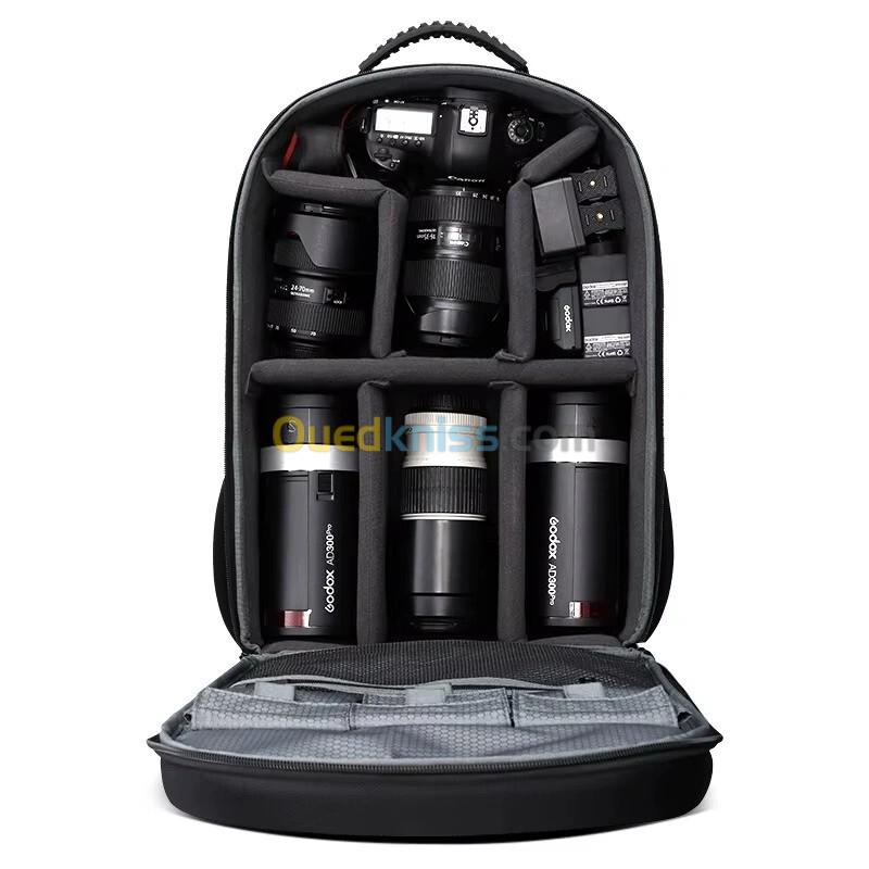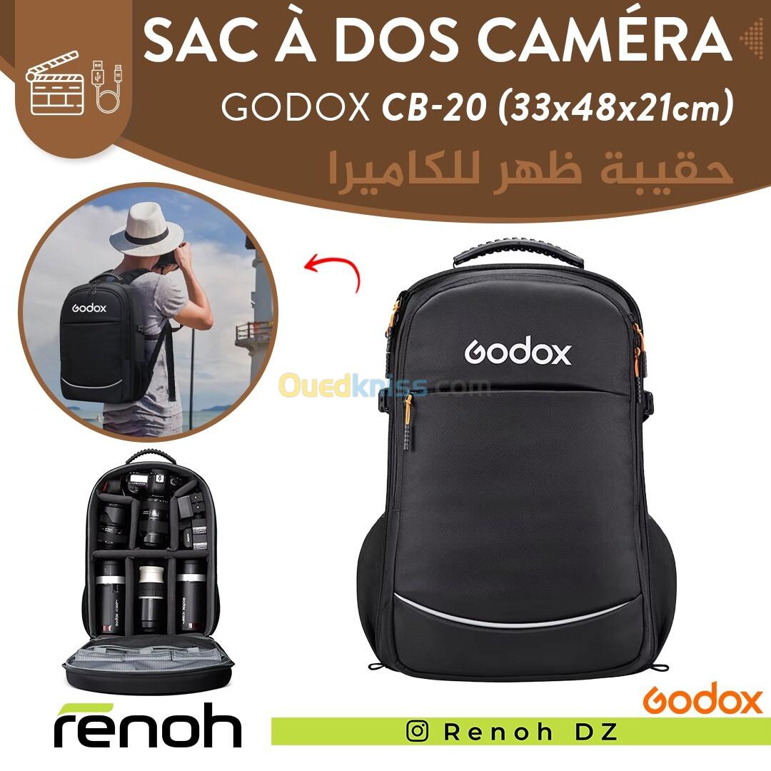 - Le sac à dos Godox CB-20 est spécialement conçu pour transporter en toute sécurité votre matériel d’éclairage et accessoires Godox. Il offre une organisation optimale pour les séances photo en studio ou en déplacement.