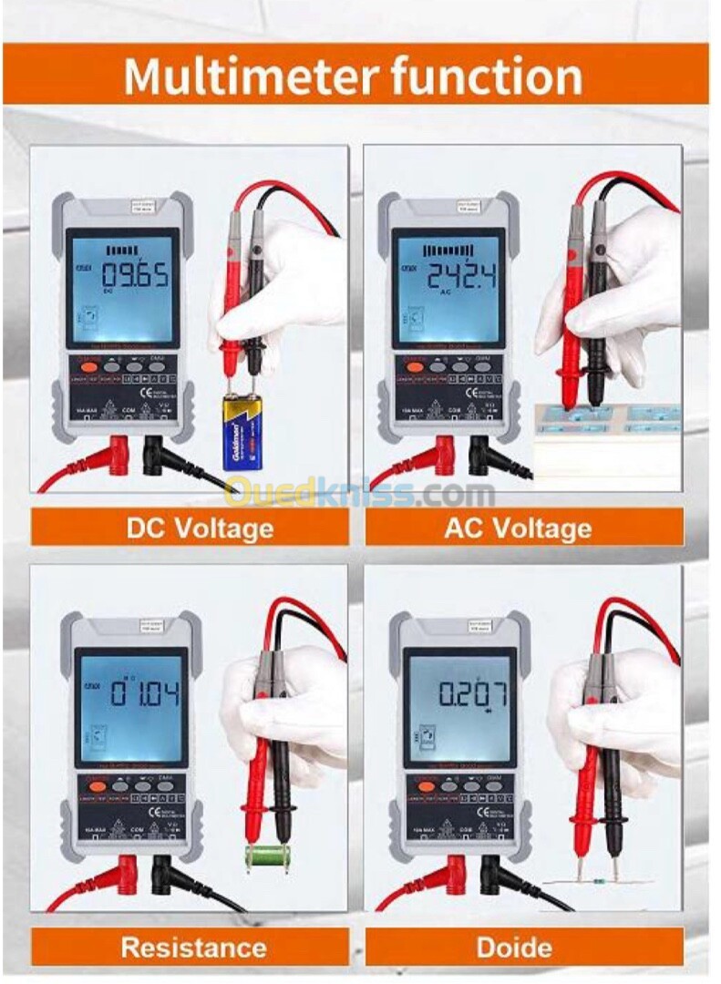 • Multimètre complet : Permet la mesure de tension (AC/DC), courant, résistance, fréquence, capacité, température, etc.