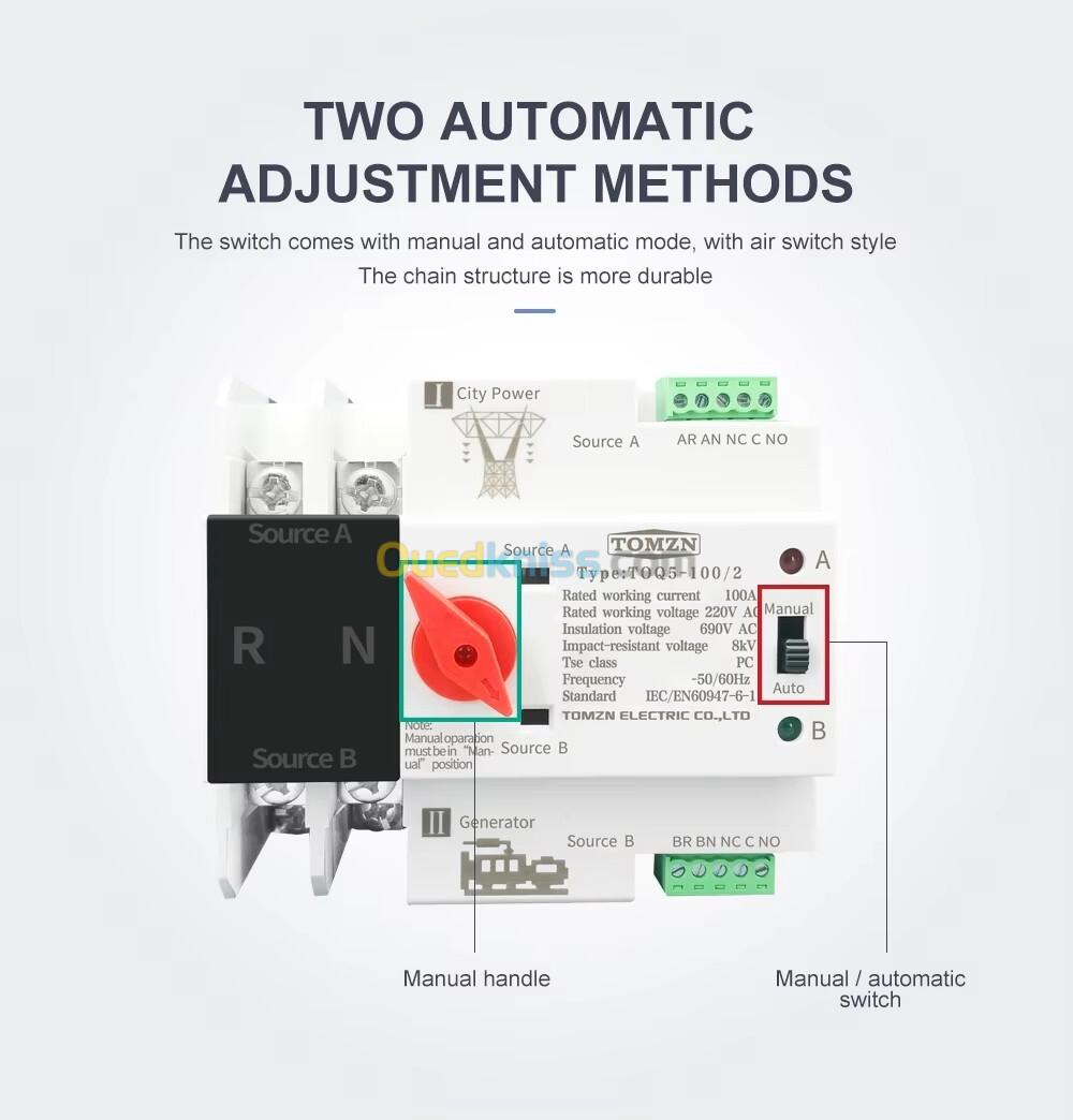 Commutateur électrique ininterrompus 50-60hz 2P 63A 100A de transfert automatique de double puissance d'ats de Rail monophasé de TOMZN Din