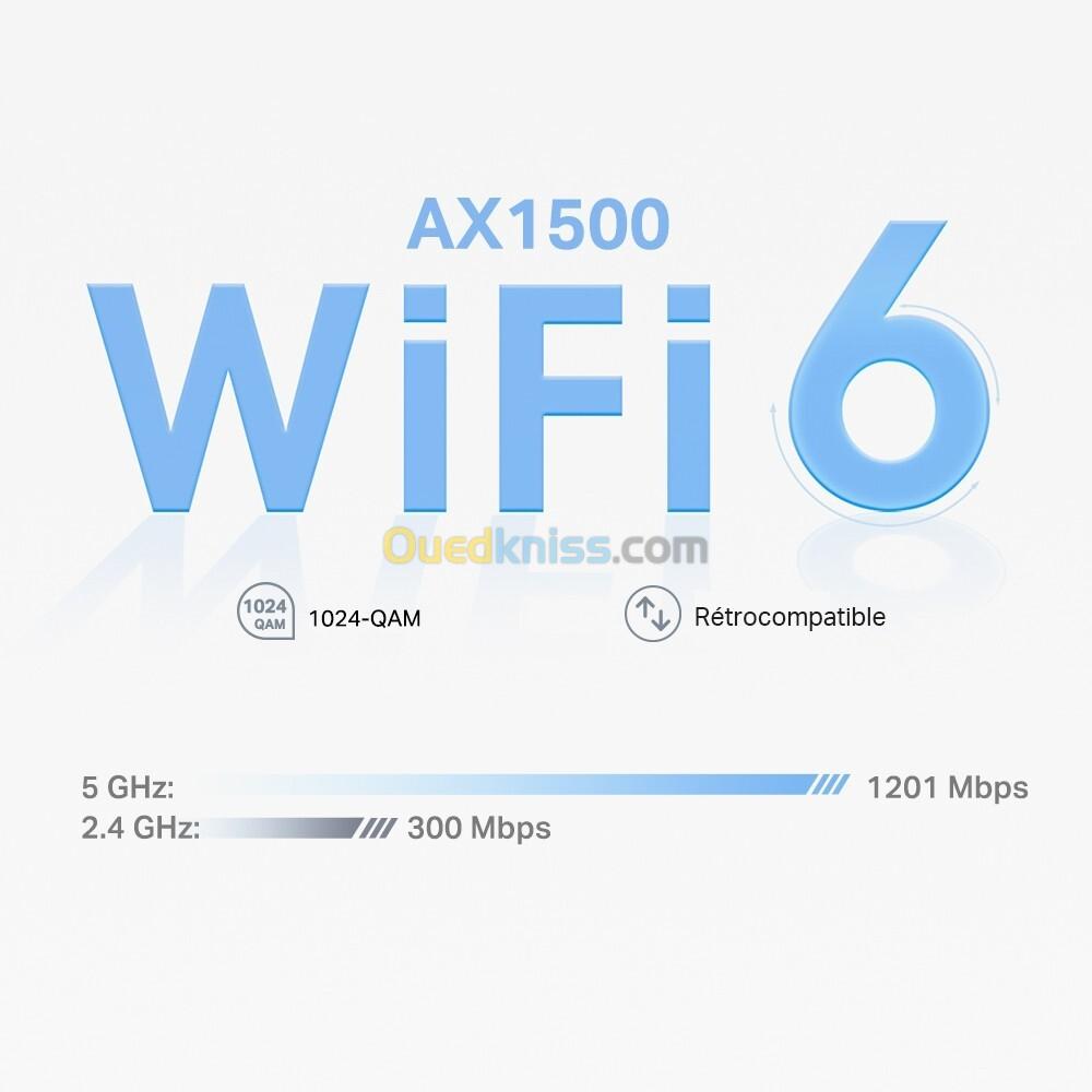 Connexions plus rapides : débits WiFi 6 jusqu'à 1 500 Mbps, 1 201 Mbps sur 5 GHz et 300 Mbps sur 2,4 GHz. †