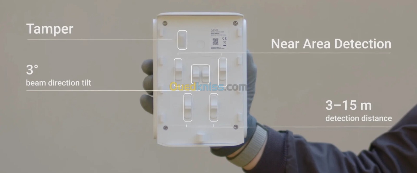 DualCurtain Outdoor dispose d'une technologie permettant d'étendre la zone protégée et qui est unique pour un détecteur de mouvement rideau d'extérieur. Lorsque la détection de zone rapprochée est activée, le capteur PIR supérieur du détecteur dispose d'un champ de détection étroit supplémentaire dirigé à un angle de 40 degrés vers le bas par rapport au champ principal. Cette fonction permet aux deux capteurs de détecter les mouvements d'une personne qui traverse le périmètre protégé à proximité du détecteur. Cette spécificité résout le problème des angles morts que ce type de détecteur rencontre en général.