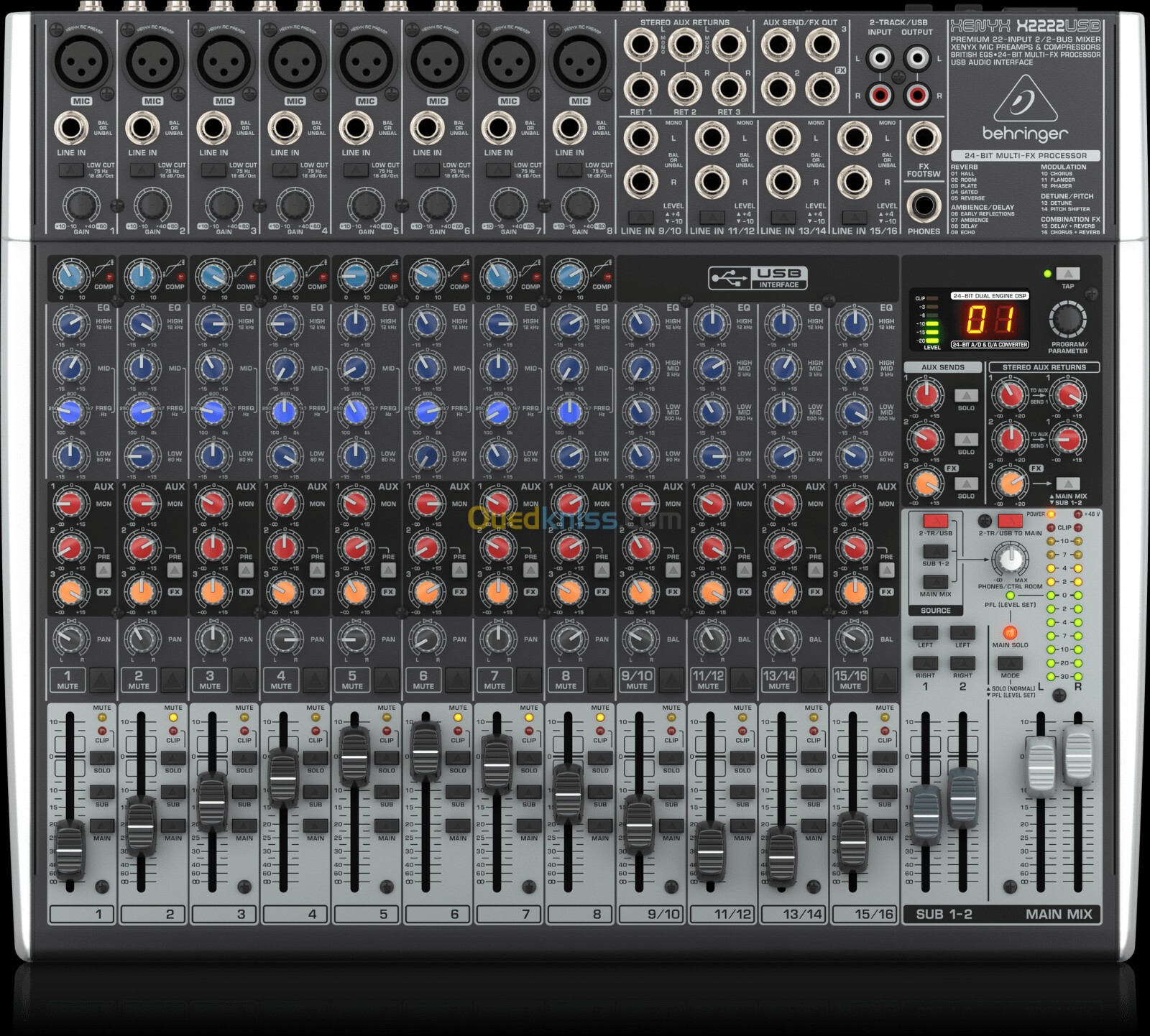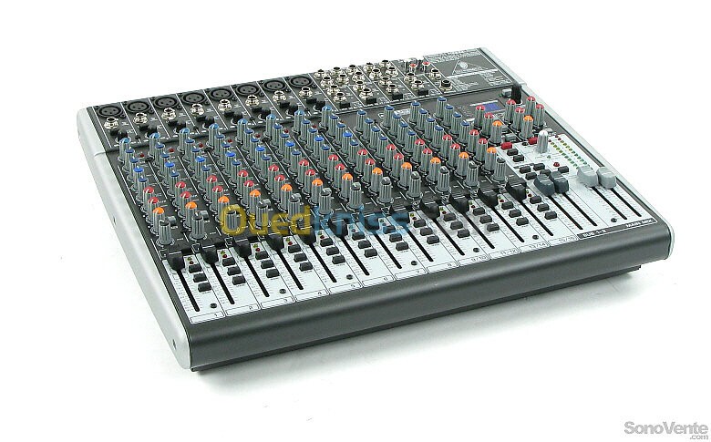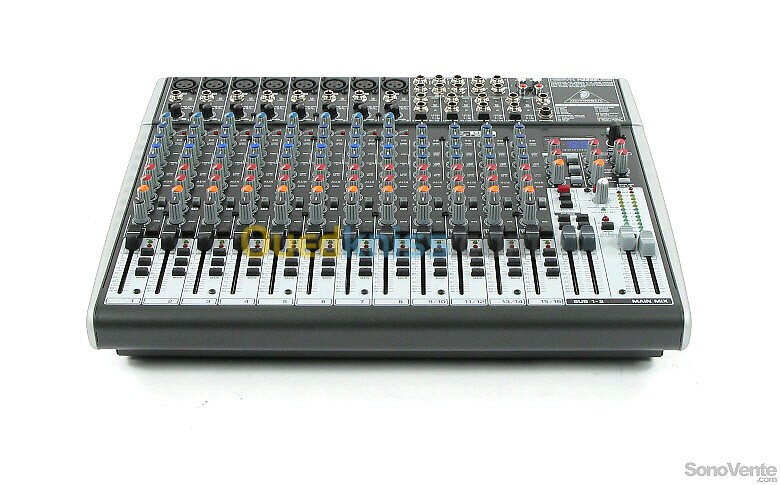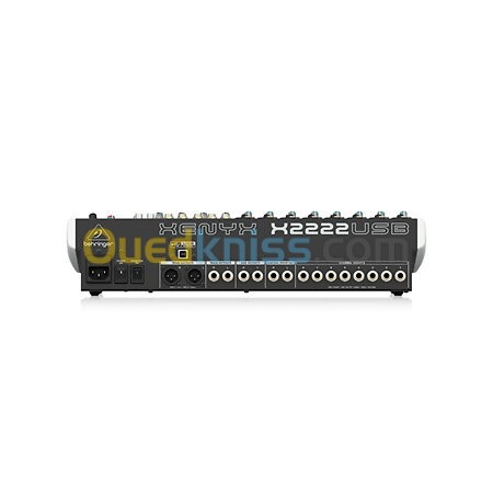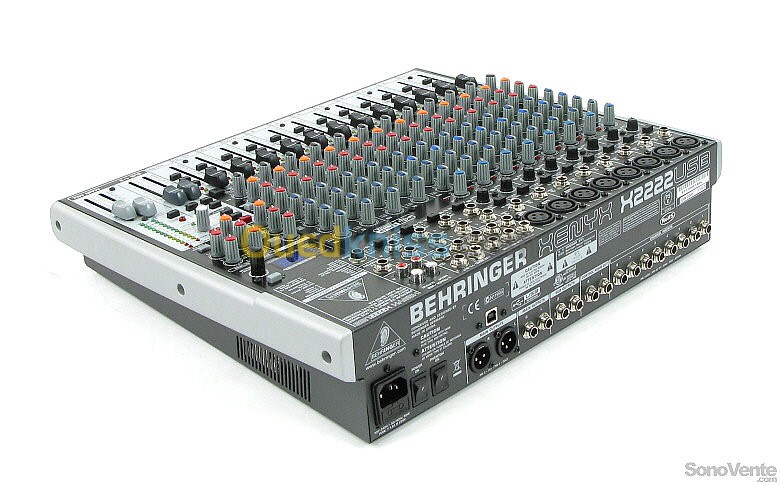 Console de mixage analogique Quels que soient vos besoins en matière de mixage audio, la X2222USB offre les performances et les fonctionnalités qui feront passer votre talent au niveau supérieur, un prix qui ne manquera pas de vous étonner. Elle dispose de 22 voies dont 8 équipées de compresseurs de qualité studio, bas sur des équipements de studio classiques et célèbres des années 70. Le X2222USB est équipé d'inserts de canal pour tous les canaux mono utiliser avec les effets externes. 22 canaux 8 entrées microphone avec alimentation fantôme +48 Volt et filtre coupe-bas 75 Hz EQ 3 bandes avec médiums paramétriques, compresseur et insert par canal micro 4 entrées stéréo 3 retours stéréo 3 voies auxiliaires Commutateur Mute et LED de crête par canal Unité multi-effets 24 bits interne avec 16 préréglages 2 sous-groupes avec sortie séparée Faders de 60 mm Entrée et sortie 2-Tracks Sorties Main sur XLR Carte son USB intégrée Alimentation interne Dimensions (H x L x P): 90 x 430 x 355 mm Poids: 4,78 kg Kit de montage en rack 19" incl.
