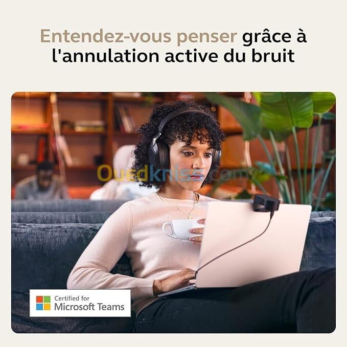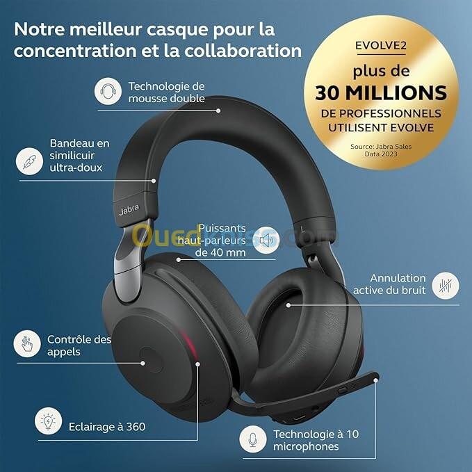 -Le Jabra Evolve2 75 est un casque over-ear haut de gamme, pensé pour les professionnels exigeants : ANC de référence, micro retractable discret, autonomie remarquable, confort longue durée, multi-connectivité, busylight 360°.