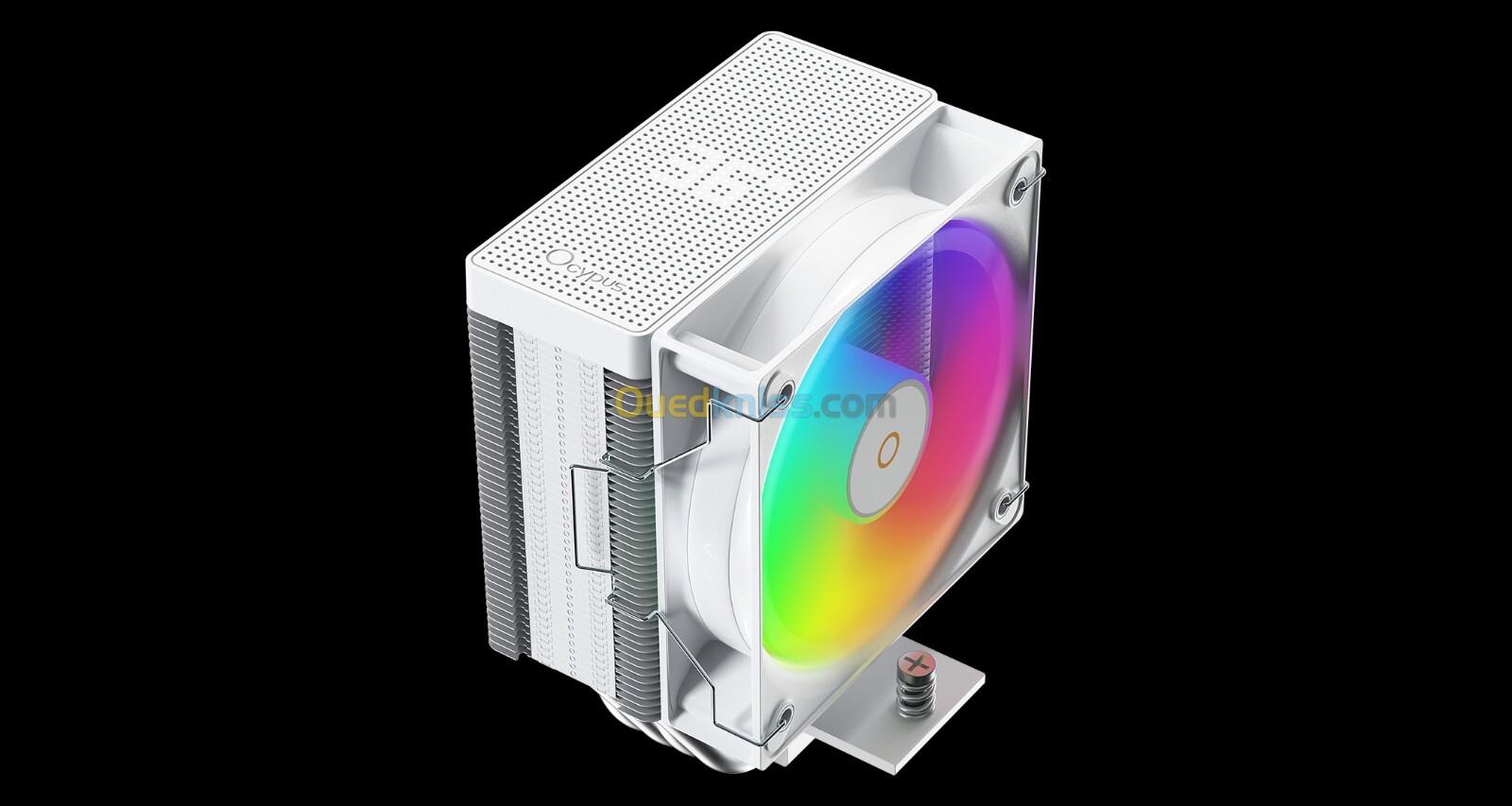 REFROIDISSEUR OCYPUS GAMMA A40 WHITE ARGB DIGITAL Spécifications Techniques – Ventirad CPU Compact ARGB TDP : 200 W Compatibilité des sockets CPU : Intel : LGA 115X / 1200 / 1700 / 1851 AMD : AM4 / AM5 Dimensions du produit : 105 × 93 × 133 mm (L × l × H) Poids net : 410 g Caloducs : 4 × Φ6 mm Nombre de ventilateurs : 1 Ventilateur Dimensions : 100 × 100 × 25 mm (L × l × H) Type de roulement : Palier hydraulique Vitesse : 600 ~ 2 400 RPM ±10 % Débit d’air (max) : 41 CFM Pression statique (max) : 2,2 mmH₂O Niveau sonore : ≤ 29,5 dB(A) Tension nominale : 12 VDC Courant nominal : 0,10 A Consommation électrique : 1,2 W Connecteur : 4 broches PWM Éclairage LED – Ventilateur Type : ARGB Connecteur : 3 broches Tension nominale : 5 VDC Courant nominal : 0,25 A Consommation électrique : 1,25 W