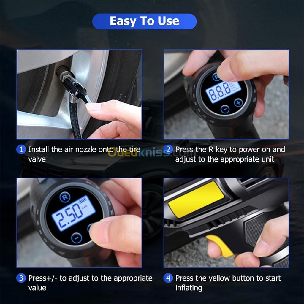 تم تصميم هذا الكمبريسور الكهربائي للسيارة ليمنحك حلاً سريعًا وفعّالًا لنفخ الإطارات في أي وقت وأي مكان. بفضل مسدس النفخ المدمج مع شاشة LED، يمكنك مراقبة ضغط الهواء بدقة حتى أثناء الليل 🌙.