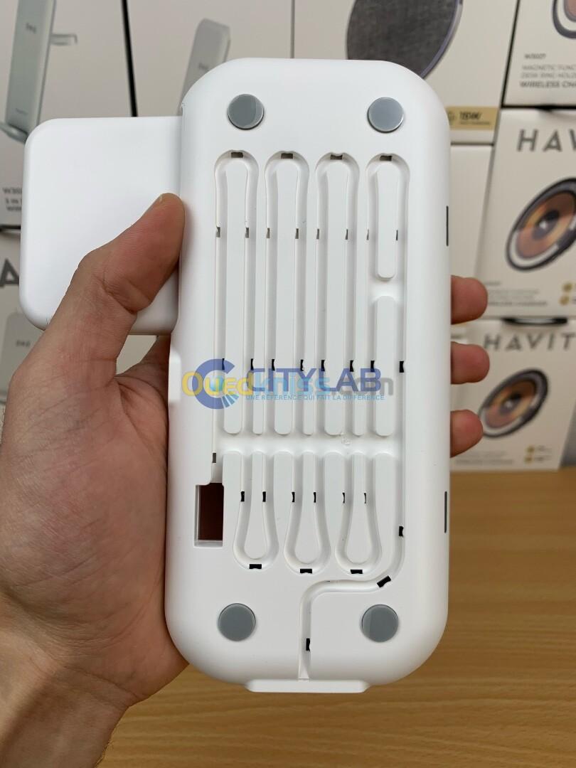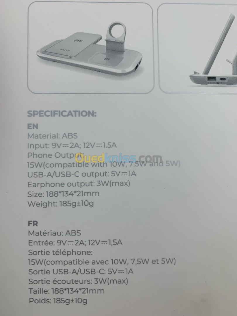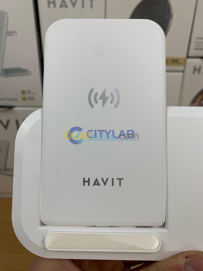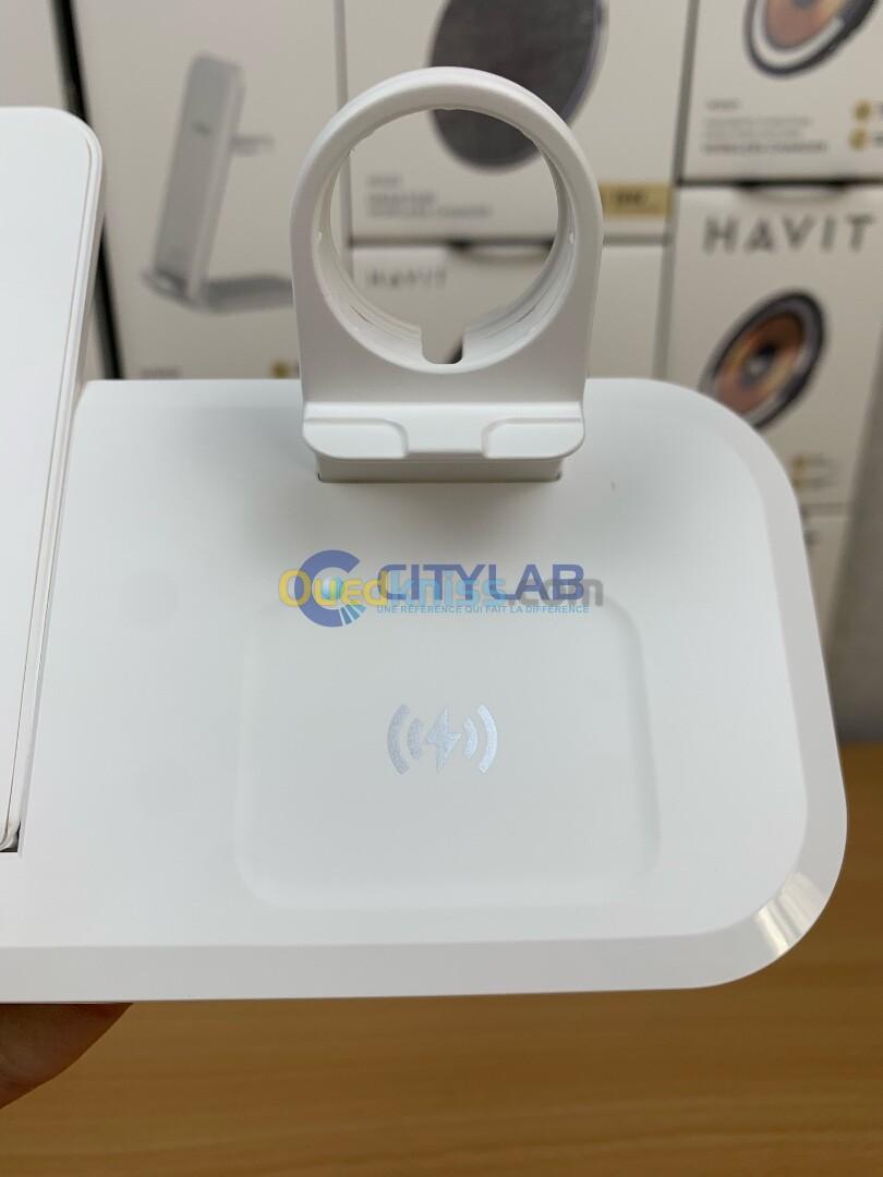 Chargeur HAVIT W3020 WIRELESS 3in1 15W ( compatible with 10w . 7.5w and 5w) sortie ecouteurs 3w (max) sortie usb-a / usb-c 5v 1a poids 185g+10g STAND / 9v 2a / 12v 1.5a size 188*134*21mm