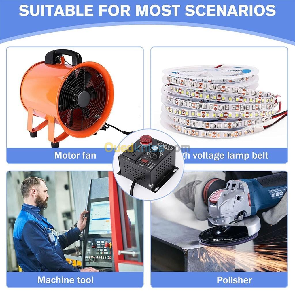Facile à utiliser : il peut régler la tension, la température et la lumière. Convient pour les robinets, les couvertures chauffantes, les fers à souder électriques, les cuiseurs à riz, les bouilloires, les perceuses électriques, les scies électriques, les polisseuses, les meuleuses d’angle, etc.