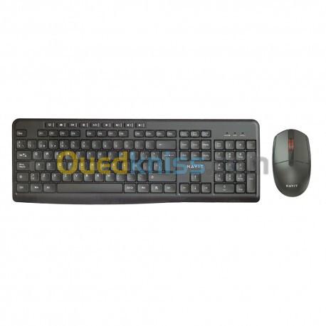 Combo Clavier + Souris sans fil Havit KB269GCM – Wireless 2.4 GHz Description Ensemble clavier et souris sans fil 2.4 GHz offrant une connexion stable, un confort d’utilisation et une installation simplifiée avec un seul récepteur USB. Idéal pour le bureau, le télétravail ou un usage domestique quotidien. Caractéristiques techniques Clavier : Type : membrane, frappe silencieuse Touches : 104 touches standard Disposition : AZERTY (selon version) Connexion : sans fil 2.4 GHz Fonctions : touches multimédias intégrées Portée : jusqu’à 10 mètres Souris : Type : optique sans fil Résolution : 1000 DPI Boutons : 3 + molette de défilement Design : ambidextre et ergonomique Caractéristiques générales : Récepteur unique USB nano pour les deux périphériques Compatibilité : Windows, macOS, Linux Installation : plug & play, aucun pilote requis Alimentation : piles (incluses selon modèle) Points forts Connexion sans fil stable et réactive Espace de travail épuré sans câbles Frappe silencieuse adaptée aux environnements partagés Souris précise pour une navigation fluide Économique et fiable pour un usage quotidien Utilisation recommandée Bureautique et télétravail Établissements scolaires et formations Usage familial et multimédia Postes fixes ou nomades sur PC et ordinateurs portables