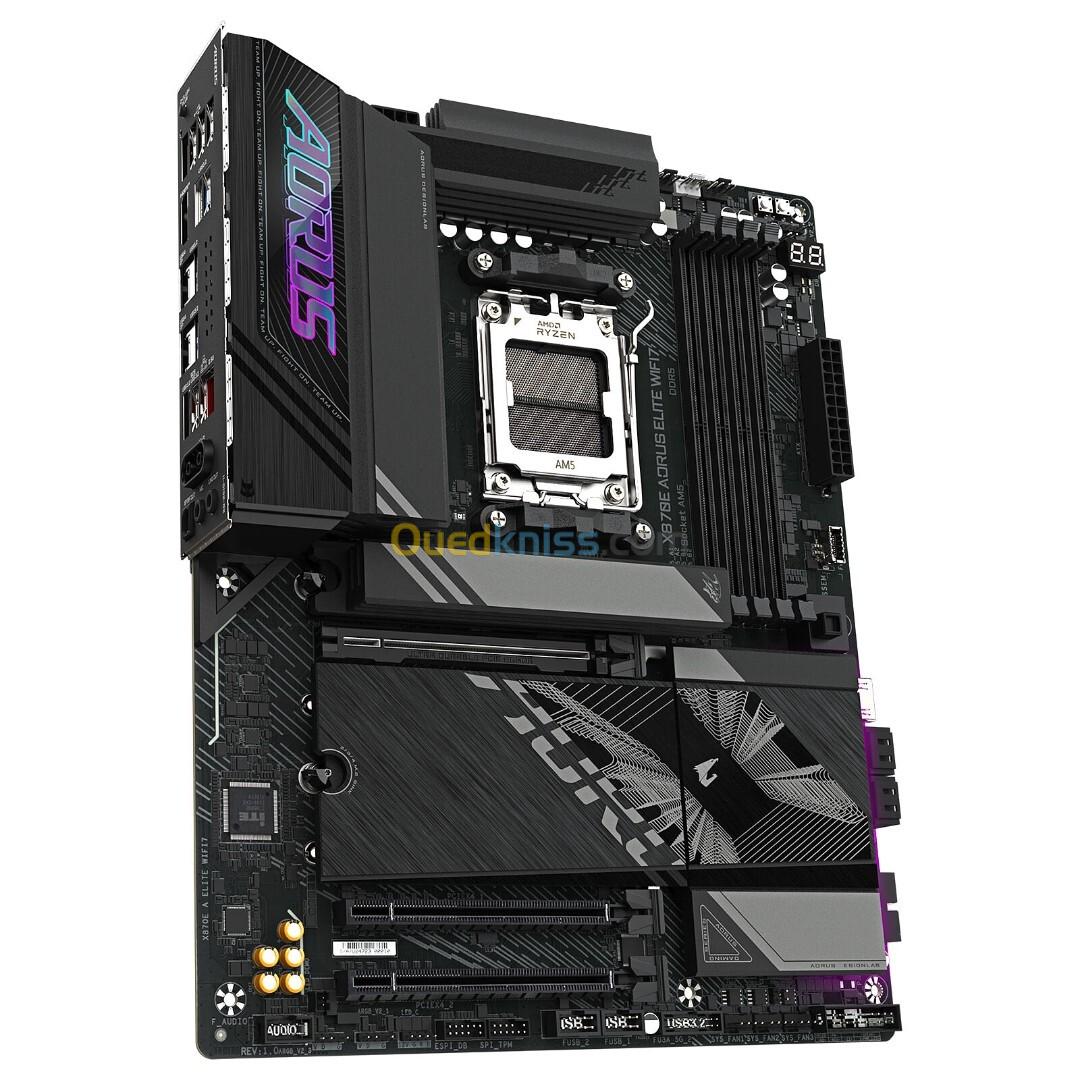 ✅INFORMATIONS GÉNÉRALES : ✅Désignation : GIGABYTE X870E AORUS ELITE WIFI7 - CARTE MÈRE ATX - SOCKET AM5 - 4xDDR5 - BLUETOOTH - 4xM.2 -LAN 2.5 ✅Marque : GIGABYTE ✅Modèle : X870E A ELITE WIFI7 Gigabyte X870E AORUS ELITE WIFI7 Carte mère ATX Socket AM5 AMD X870E - 4x DDR5 - M.2 PCIe 5.0 - USB4 - PCI-Express 5.0 16x - Wi-Fi 7/Bluetooth 5.4 - LAN 2.5 GbE ✅ Carte mère Gaming socket AM5, DDR5 et PCI-Express 5.0 La carte mère Gigabyte X870E AORUS ELITE WIFI7 embarque le chipset AMD X870E ce qui la rend idéale pour poser les bases d'une configuration gaming hautes performances. Son socket AMD AM5 lui permet de prendre en charge un processeur AMD Ryzen 7000/8000/9000. Elle est dotée de 4 emplacements DDR5, peut exploiter les cartes graphiques et les SSD M.2 NVMe à la norme PCI Express 5.0 pour des performances décoiffantes. Elle est dotée d'une connectivité complète avec du réseau LAN 2.5 GbE, Wi-Fi 7 et du Bluetooth 5.4 ainsi que de l'USB 3.2 et 4.0. ✅ Les plus de la Gigabyte X870E AORUS ELITE WIFI7 Socket AMD AM5 pour processeur AMD Ryzen 7000/8000/9000 4 Slots mémoire DDR5 8200 MHz (OC) Dual-Channel avec support EXPO et XMP Stockage nouvelle génération : 3 x M.2 PCIe 5.0 + 1 x M.2 PCIe 4.0 EZ-Latch PLus : Verrouillage/Déverrouillage rapide du PCIe 5.0 x16 et des M.2 (pas besoin de vis) Dissipation efficace avec radiateurs sur les VRM (VRM Thermal Armor) et pour les SSD M.2 avec Thermal Guard L Wi-Fi 7 et Bluetooth 5.4 + LAN 2.5 GbE Partie audio soignée avec chipset Realtek ALC1220 HD 2 ports USB4 Type C compatibles DP-Alt mode Q-Flash Plus : Mise à jour du BIOS sans Installer de Processeur, de Mémoire ou de Carte Graphique ✅ Jouer dans les meilleures conditions Les fréquences élevées des processeurs AMD Ryzen Zen 5 sont une véritable aubaine pour les joueurs. Choisissez les bons composants et concevez un PC Gaming surpuissant, sans latences et prêt à servir quand il faut. Prenez l'avantage sur vos adversaires et atteignez des sommets grâce aux processeurs AMD Ryzen 9000 et aux cartes mères AMD AM5. ✅ Caractéristiques générales • Type : Carte mère gaming haut de gamme • Socket : AM5 • Chipset : AMD X870E • Mémoire : DDR5 • Fréquence RAM supportée : jusqu’à 8000+ MHz (selon OC) • Slots mémoire : 4 × DDR5 • VRM : Design robuste pour CPU Ryzen série 7000 & 9000 • Format : ATX • Coloris : Noir / Métallisé ✅ Ergonomie et esthétique • Grand dissipateur thermique VRM • RGB fusion (selon version) • PCB renforcé • Blindage PCIe métal • Design premium et épuré ✔️ GARANTIE : 12 MOIS ✔️
