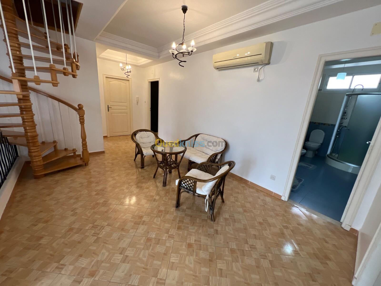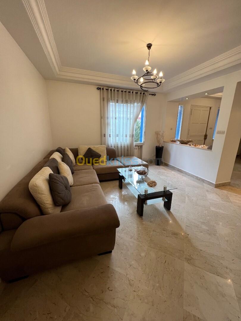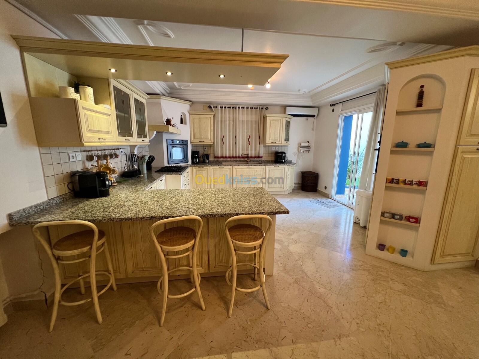 À louer une superbe villa meublée située à Plage Ouest Staoueli, dans une résidence privée, entièrement clôturée, avec service de gardiennage et caméras de surveillance 24/24.