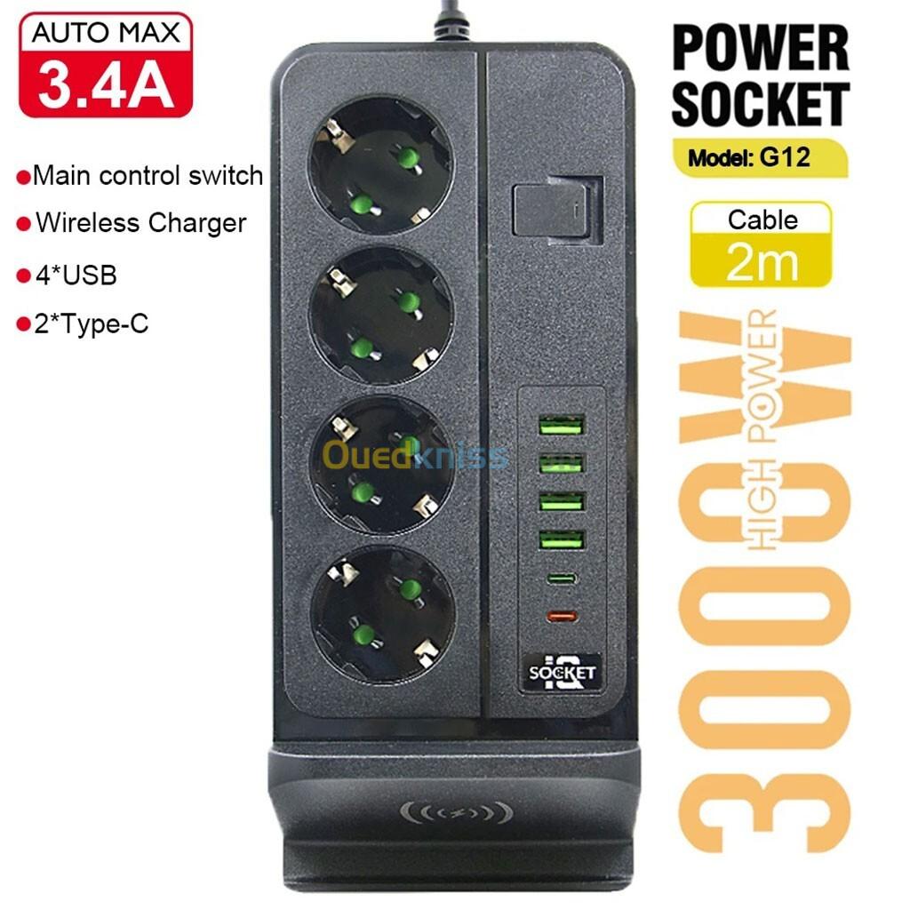 Multiprise 3000W 4 Prises, 4 Ports USB, 2 Ports Type-C avec Charge Sans Fil – مقبس طاقة مع شحن لاسلكي