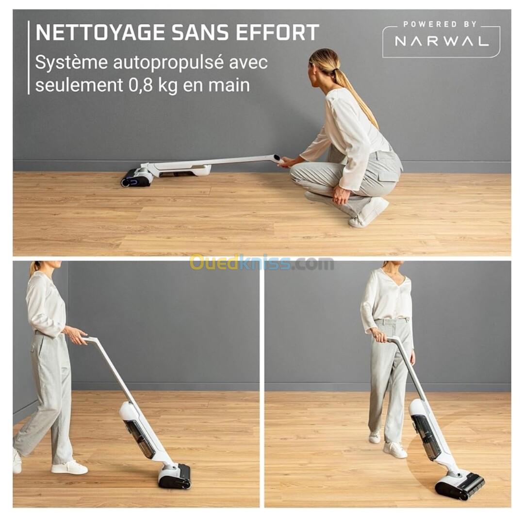 NETTOYAGE SANS EFFORT: système de rouleau autopropulsé Narwal pour une expérience de nettoyage en toute légèreté avec un poids de seulement 0,8kg en main, et un design plat à 180° pour atteindre les moindres recoins