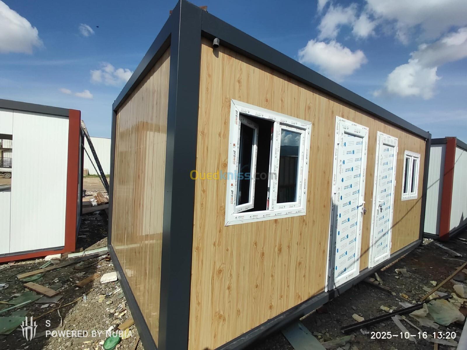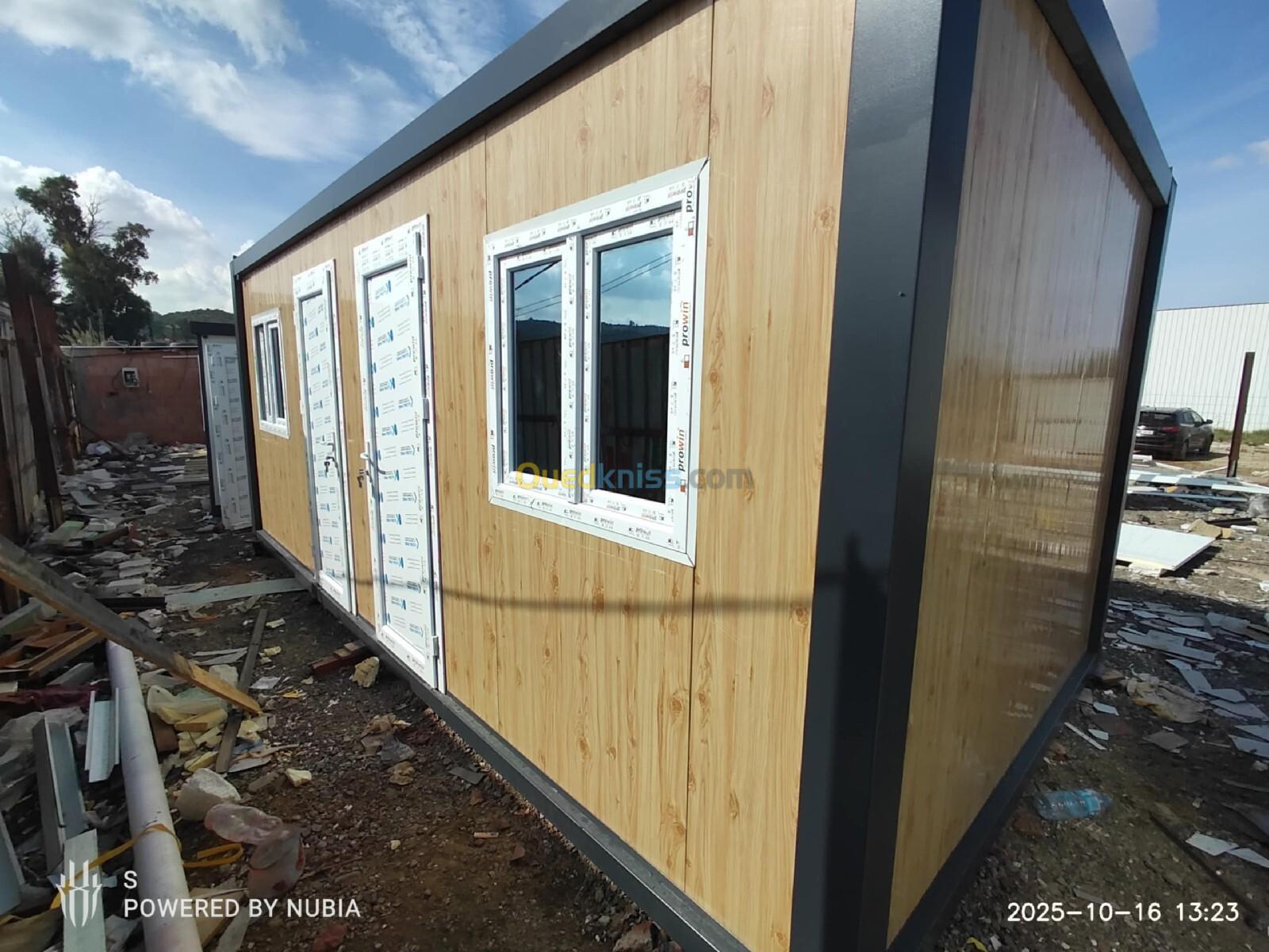 Panneau Sandwiches 40mm faux bois Strecture métallique tube carré 90mm ep 2.4mm Gouttière 7mm Installation électrique Gerflex Toiture en panneau sandwich Plancher en bois Porte et fenêtres en pvc