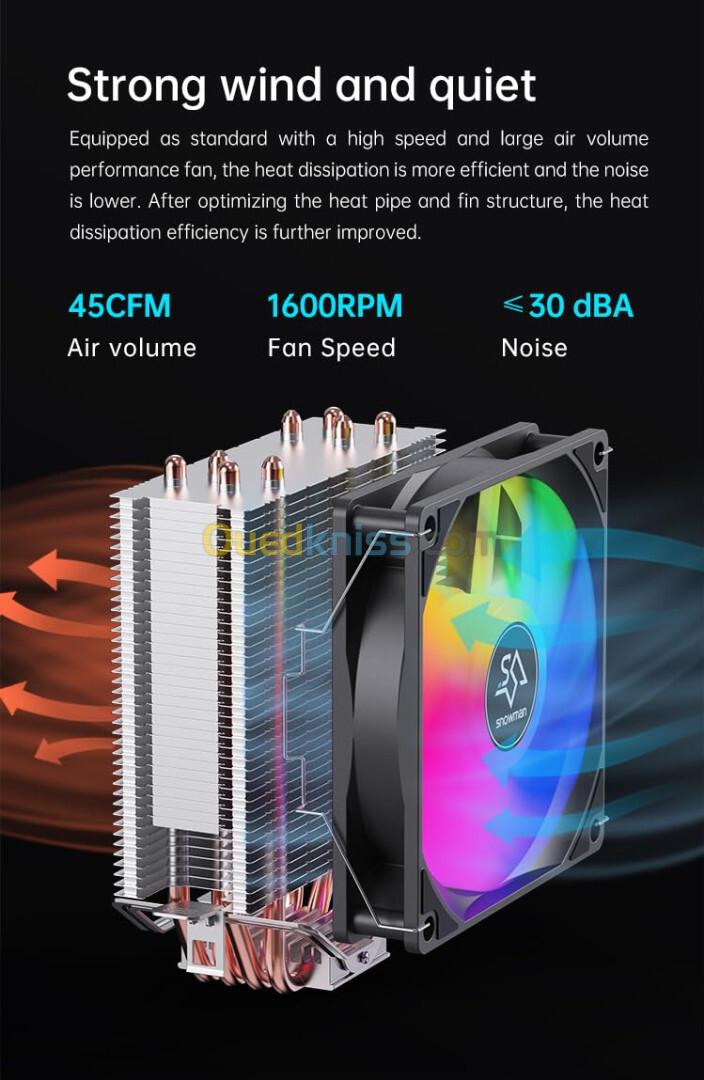 Les ailettes du refroidisseur de durcissement adoptent une technologie de courbure qui favorise une bonne ventilation et améliore la conduction thermique entre les ailettes, augmentant ainsi l'efficacité du refroidissement et les performances globales du système. *Capacité de refroidissement thermique (TDP) jusqu'à 160 W: Ce refroidisseur permet de refroidir les processeurs jusqu'à 160 W TDP, idéal pour les processeurs hautes performances et les applications lourdes.