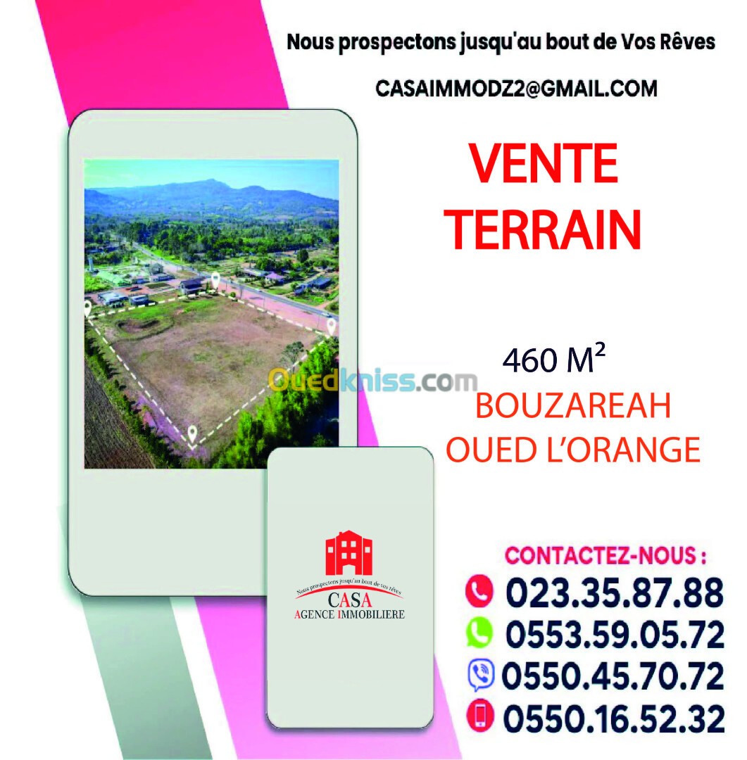 BOUZAREAH, Oued L'Orange — Casa Immo met en vente un terrain d'une superficie de 460 m², avec trois façades : 14,5 m - 22 m, viabilisé et fourni avec : acte + certificat d'urbanisme R+4.