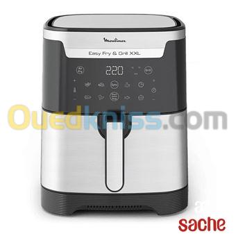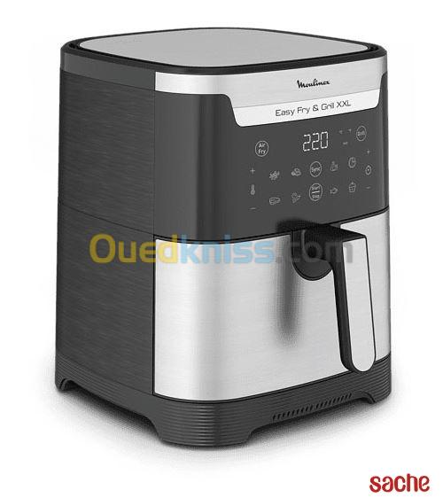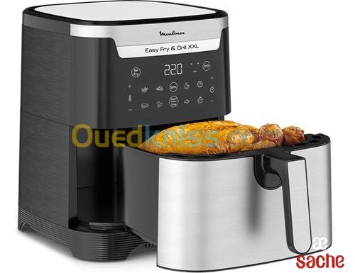 Caractéristiques La première friteuse sans huile 2-en-1 de Moulinex : Air Fry &Grill XXLFaites plaisir à votre famille avec des repas délicieux et sains, préparés dans votre propre cuisine, grâce à lafriteuse à air chaud et au gril XXL Moulinex Easy Fry & Grill 2-en-1. Un sé...