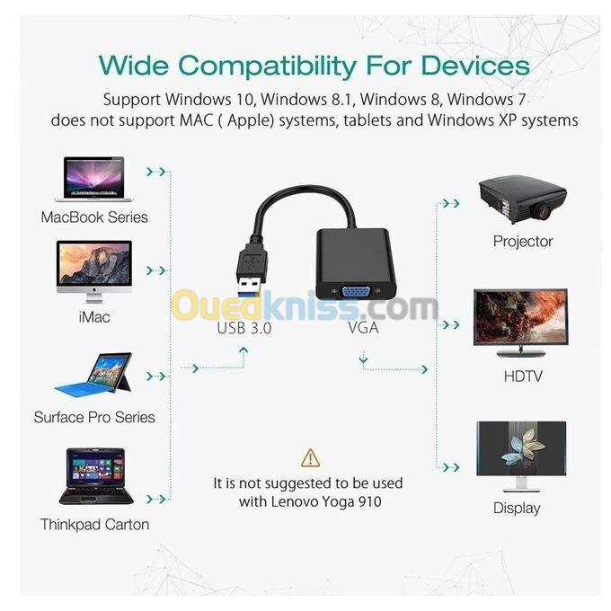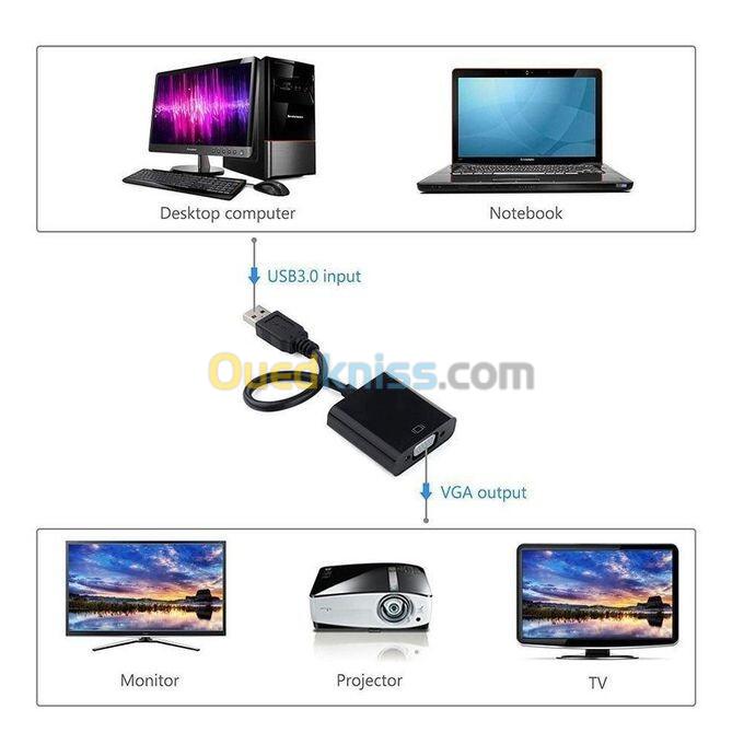 L’adapteur USB 3.0 vers VGA est utilisé pour connecter un appareil USB compatible(comme un ordinateur portable/bureau) avec un appareil VGA compatibles(tels que moniteur,projecteur,TV) pour la solution multi-écrans