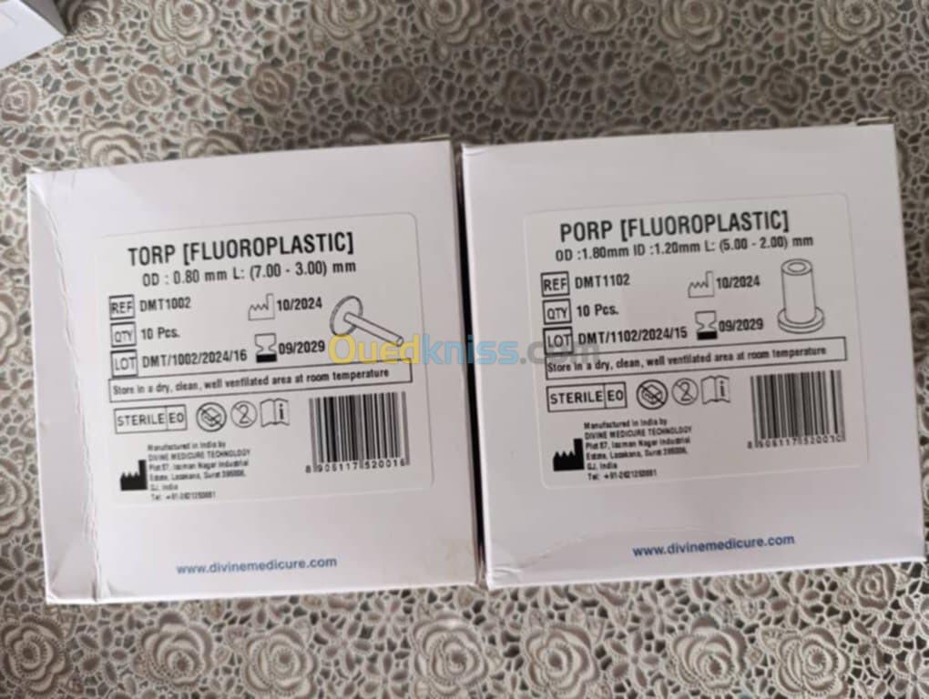 Voici quelques informations sur ces produits : Type de produit : Prothèses ossiculaires totales (TORP) et partielles (PORP) en fluoroplastique (PTFE/Teflon). Utilisation : Implants d'oreille moyenne pour la reconstruction de la chaîne ossiculaire (ossiculoplastie). Compatibilité : Biocompatibles avec les tissus biologiques et compatibles avec l'IRM. Fabricant : Fabriquées par Divine Medicure (le site web est visible sur les boîtes) et EON Meditech Pvt. Ltd. Spécifications : Les longueurs sont ajustables par le chirurgien (ex: TORP de 7,00 mm à 3,00 mm, PORP de 5,00 mm à 2,00 mm). Avertissement : Ces dispositifs sont des instruments médicaux stériles et leur utilisation est strictement réservée au personnel médical qualifié dans un cadre chirurgical.