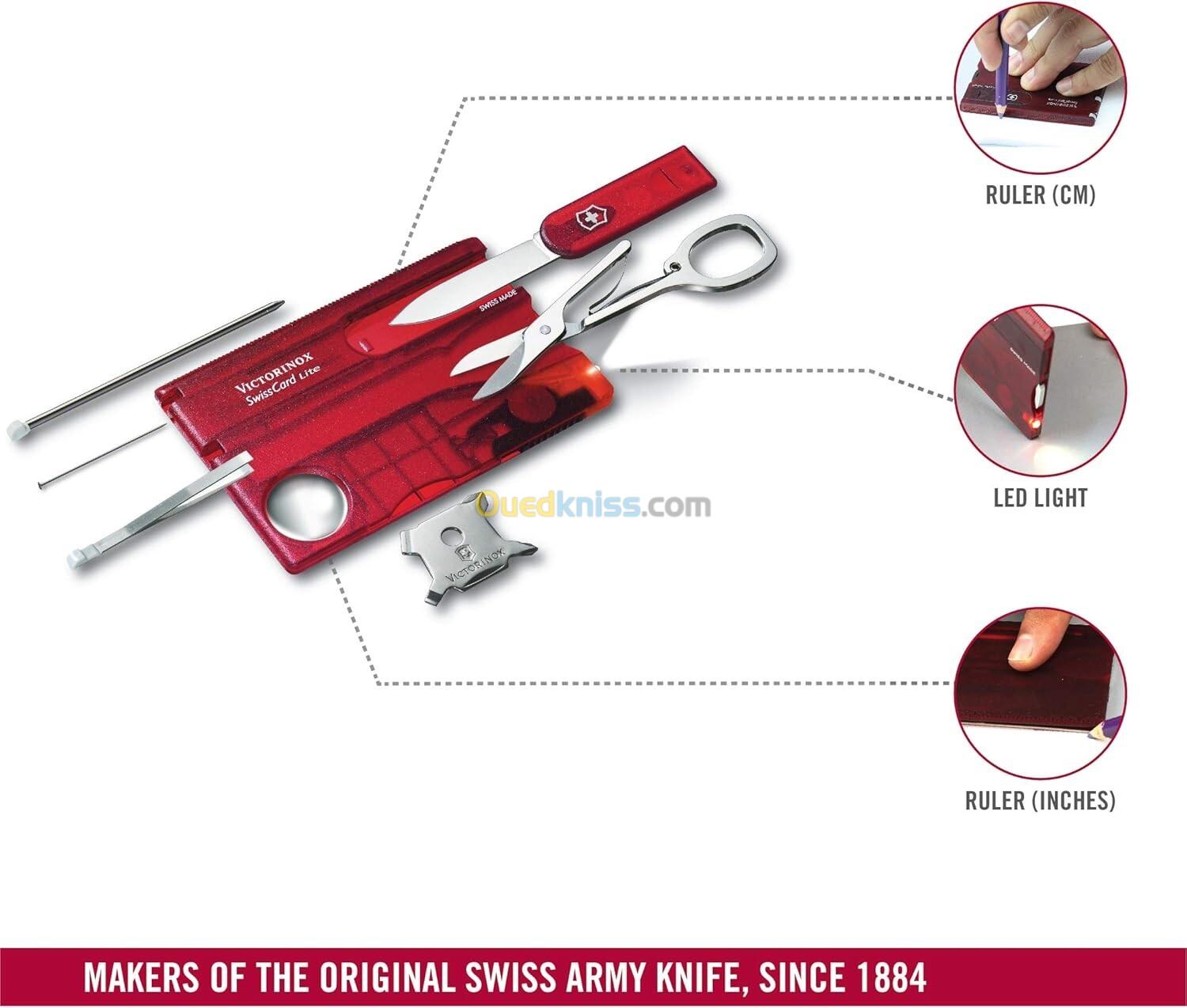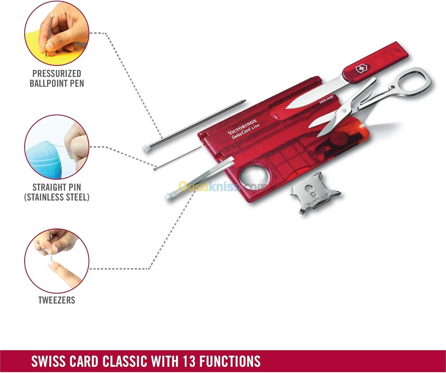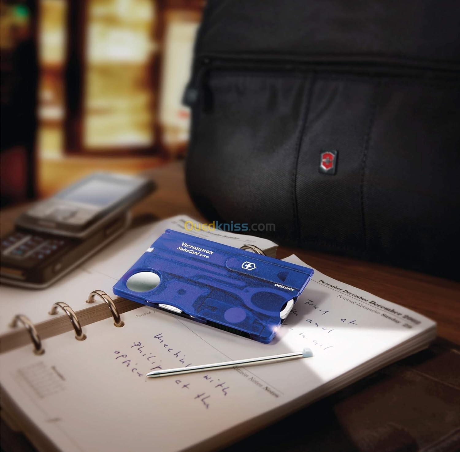 SWISS CARD LITE : la Victorinox Swiss Card Lite est un outil de survie pratique au format carte de crédit qui se glisse facilement dans le portefeuille. Parmi les fonctions les plus importantes, il convient de citer la loupe et une lampe de poche.