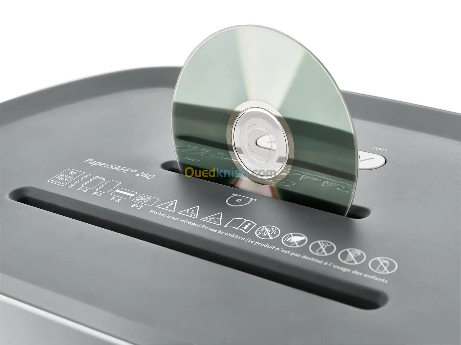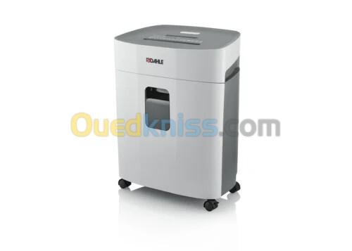 Il accepte le papier, les CD/DVD, les cartes bancaires et même les agrafes et trombones. Son démarrage et arrêt automatique, la fonction avance/retour pour débloquer un bourrage et le coffret à déchets amovible avec roulettes rendent son utilisation facile et pratique. Le niveau sonore reste faible, autour de 60 dB, ce qui le rend adapté pour un bureau.