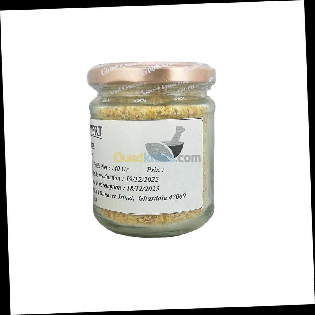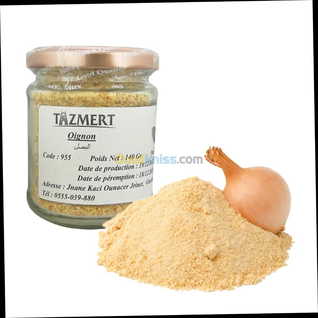 Oignon en poudre Fait Maison 100% Naturelle 140 Gr Si on ne connaît pas l’ancêtre sauvage de l’oignon, on sait en revanche qu’il est cultivé depuis plus de 5000 ans. Les premières traces de production viennent de Mésopotamie, sa culture gagnant ensuite l’Egypte antique (des textes datant de plus de 4 000 ans le mentionnent), la Grèce, l’Empire romain puis le reste de l’Europe et du Monde. Il est même symbole de l’intelligence dans la Chine ancienne. Utilisation : L’oignon est un assaisonnement essentiel pour aromatiser les plats, et un ingrédient dont la qualité est indispensable. La poudre d’oignon est composée d’oignon, purement et simplement. Plus besoin d’éplucher. Plus besoin de hacher. Adieu yeux larmoyants. La poudre d’oignon représente un atout supplémentaire et incroyablement utile dans la cuisine. Elle peut être dispersée uniformément dans le plat cuisiné pour obtenir une riche saveur d’oignon. Saupoudrez-la dans les soupes et les ragoûts, créez des trempettes crémeuses et des vinaigrettes, rehaussez les casseroles et les légumes, ou utilisez-la comme ingrédient de base pour les épices à frotter et les marinades. Votre poudre d’oignon doit dégager une odeur piquante et légèrement sucrée, comme un oignon entier réchauffé par le soleil. Les Bienfaits : • Épice haut qualité • 100% Produit naturel sans aucun additif • Pas d'arômes artificiels, Aucun agent de conservation • Emballé dans une bocal en verre scellier • Trié et filtré • Fait maison Pour vos commandes je vous invite à visiter notre site internet www.tazmert.com Merci