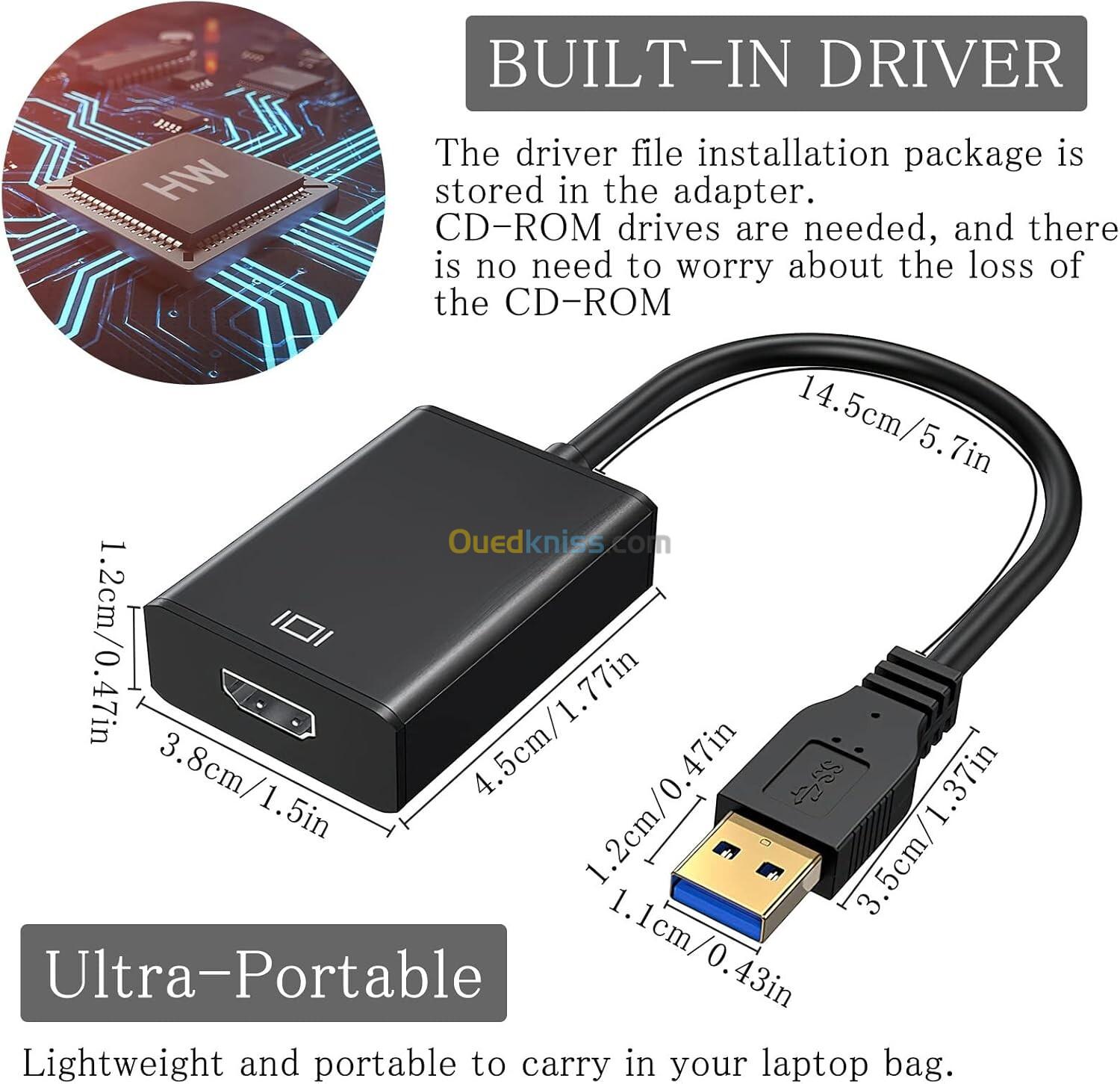 • Adaptateur USB vers HDMI: Adaptateur USB 3.0/2.0 vers HDMI est utilisé pour connecter un appareil compatible USB (eg:ordinateur portable, un ordinateur de bureau) à un appareil compatible HDMI (eg:moniteur, un projecteur, un téléviseur) pour une solution multi-moniteur. Diffusez une vidéo HD fluide sur votre projecteur ou moniteur HDTV. L'adaptateur est compatible avec Windows XP/ 7/ 8 / Vista/10/ 11/MacOS/Android. (Remarque : Linux/Chrome/Firestick ne sont pas pris en charge)