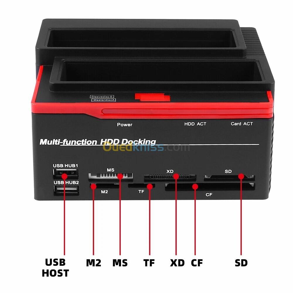• Lisez simultanément deux disques durs (6 To * 2), deux interfaces HUB d'extension USB2.0. Prise en charge de l'emplacement M2/MS/TF/SD/MMC/MS/CF/XD (carte mémoire Max64 Go, non incluse)