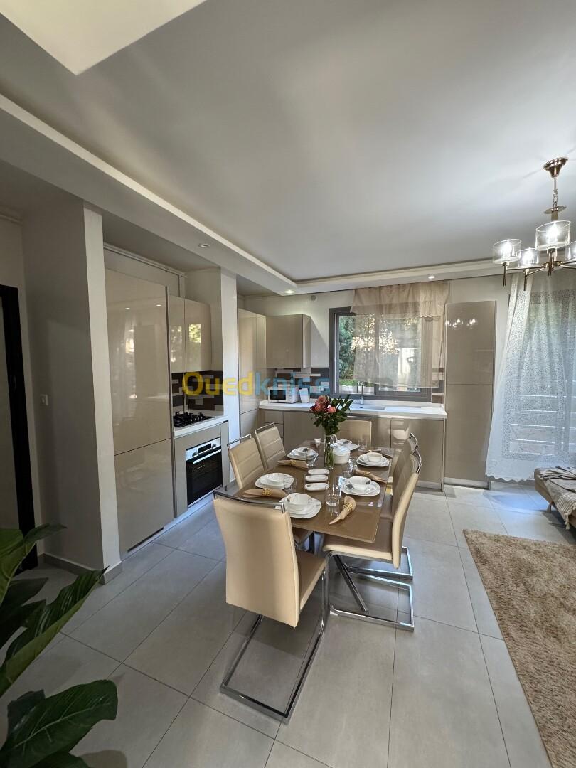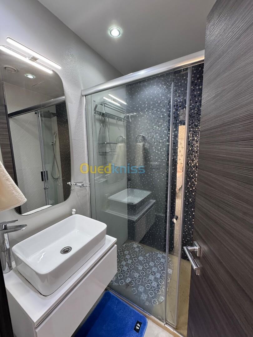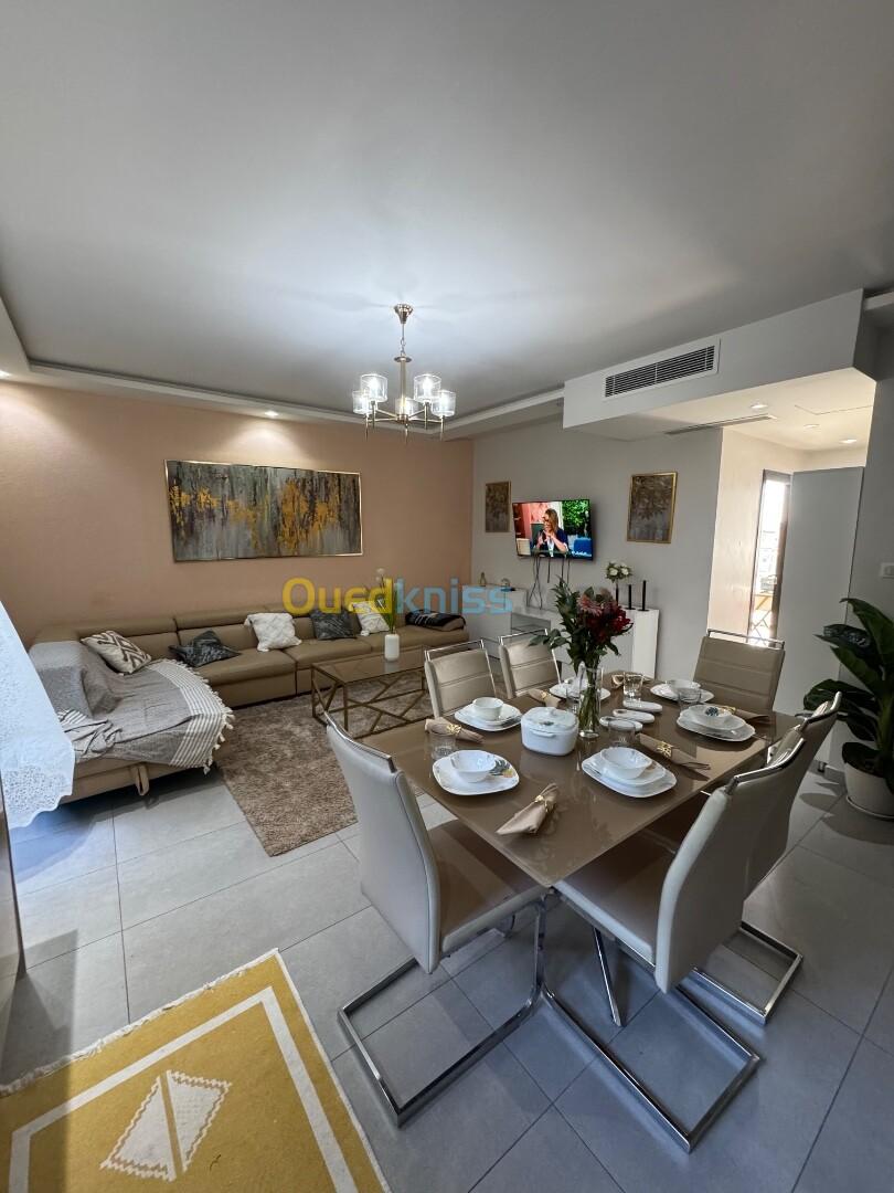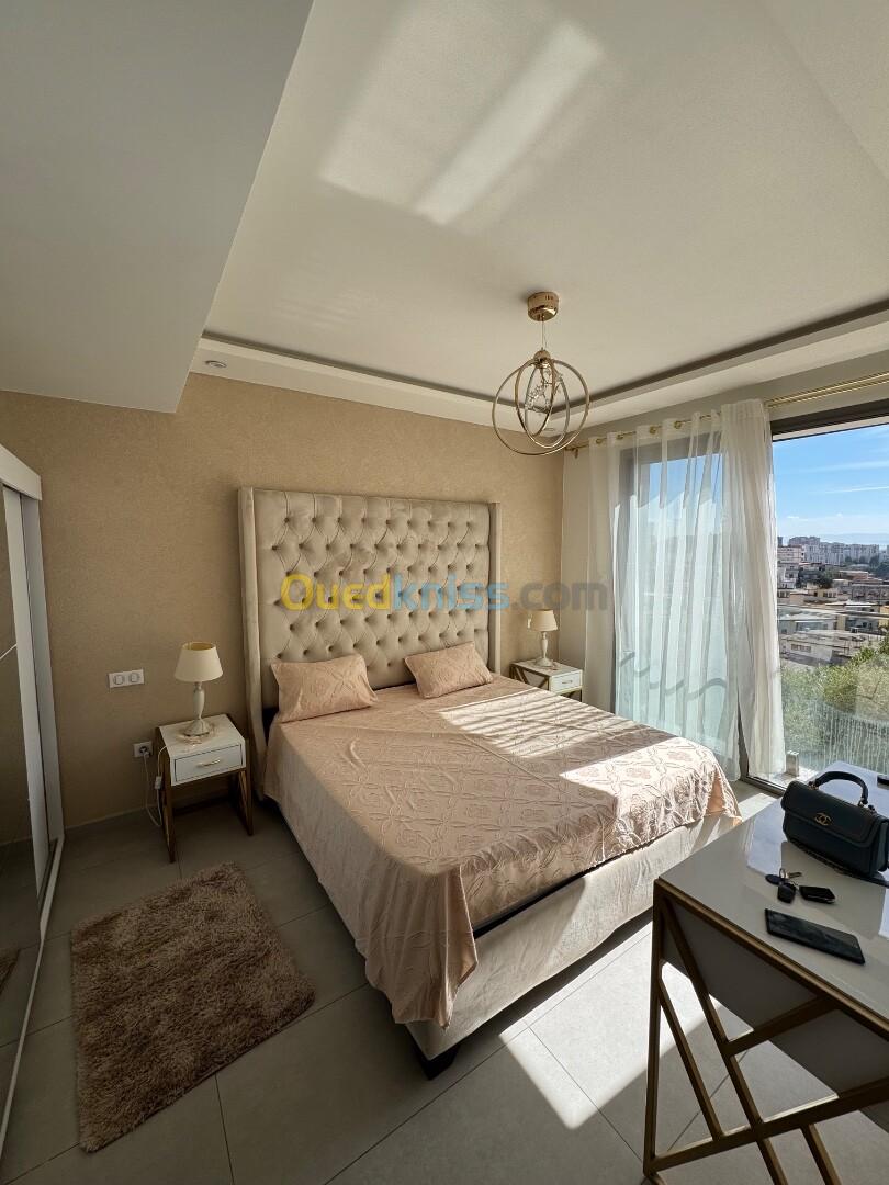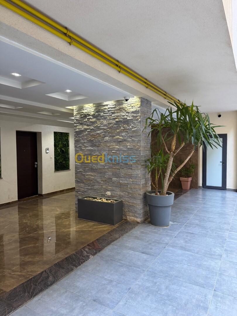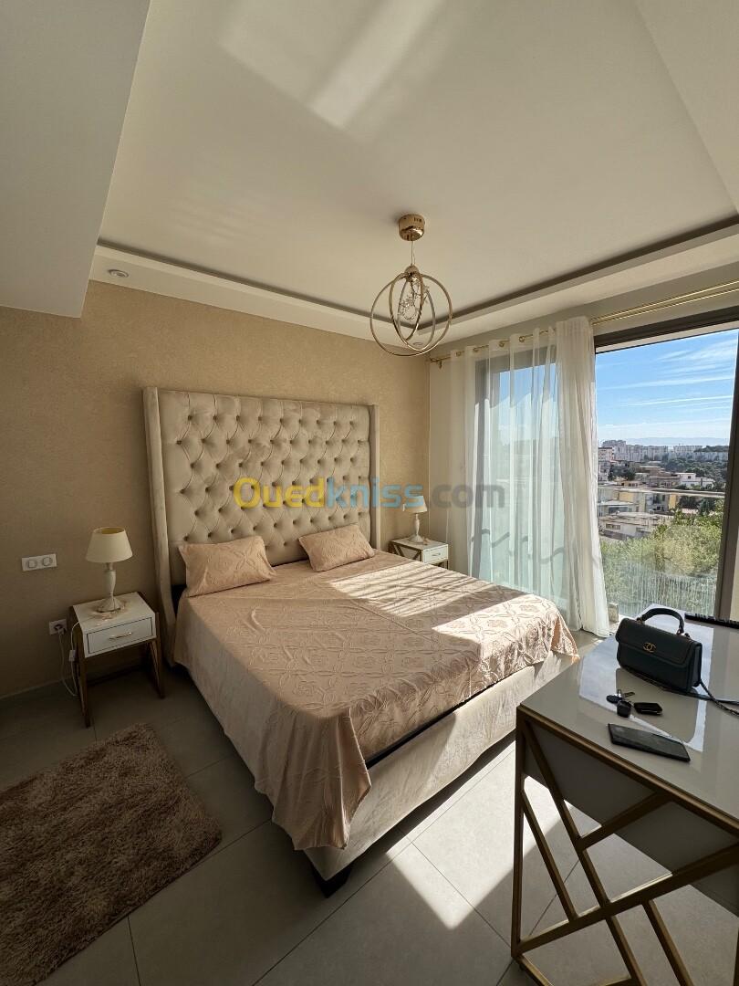 Agence Aghiles et Feriel loue un magnifique appartement entièrement meublé et équipé avec toutes les commodités dans un quartier résidentiel dans une résidence gardée et sécurisée avec caméra de surveillance gardiens et place de parking en sous-sol. Réception d'accueil et ascenseur