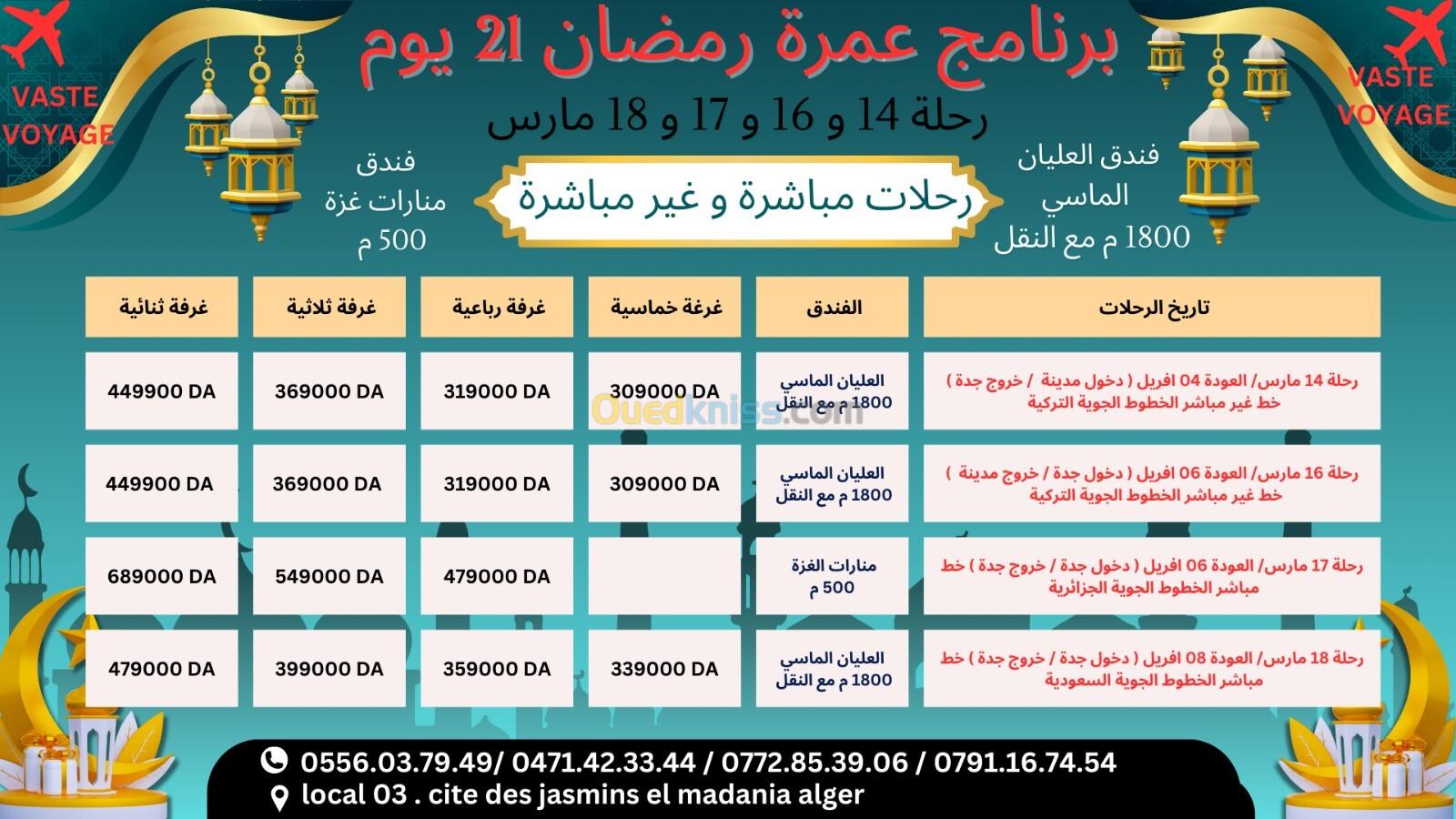 تخفيضات على عمرة 21 يوم اواخر رحلة 14 16 17 18 مارس خطوط مباشرة و غير مباشرة ابتداءا من 305000دج