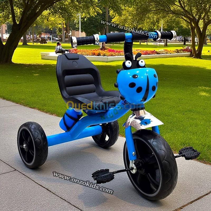 Tricycle pour enfant de 2 à 4 ans. disponible en couleur fille et garçon. une place avec gourde sur l’arrière et panier en coccinelle à l’avant.