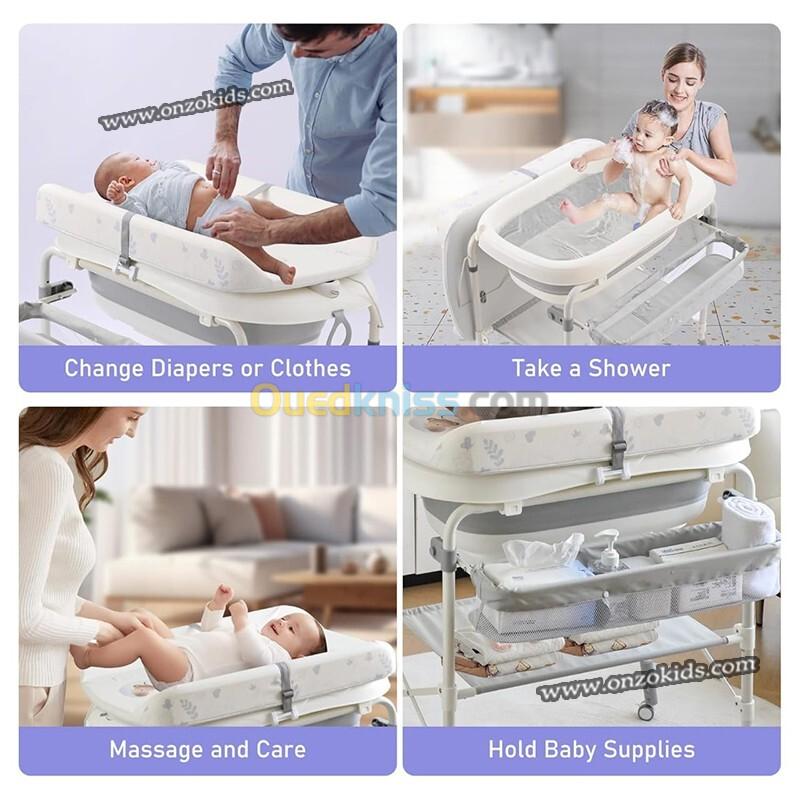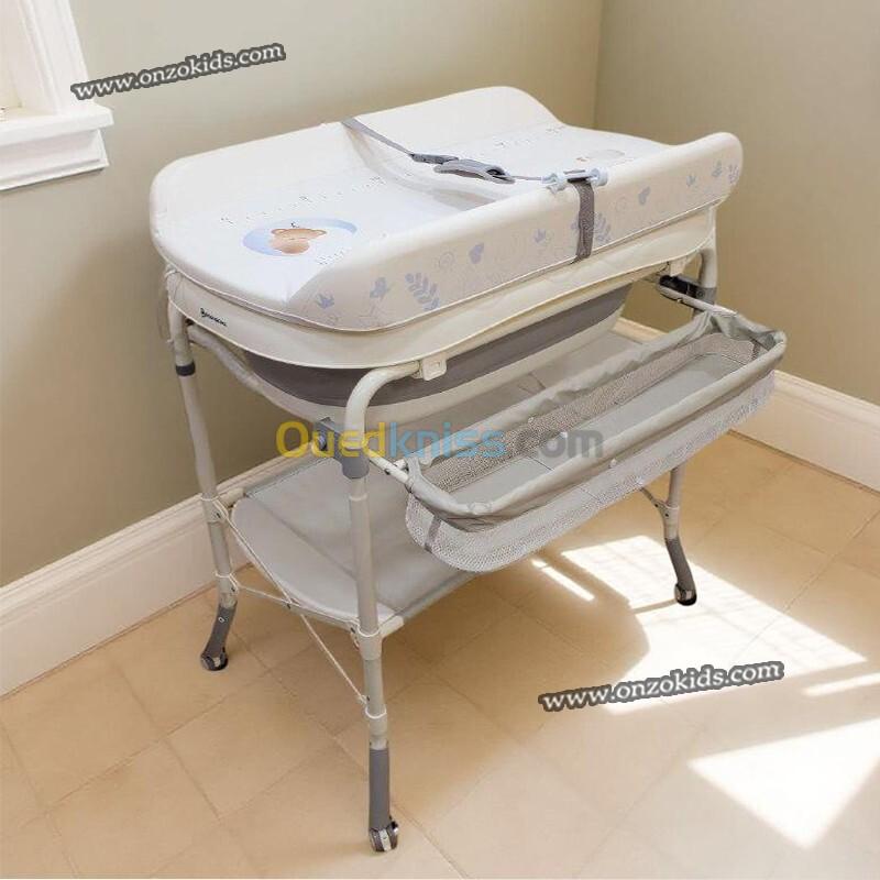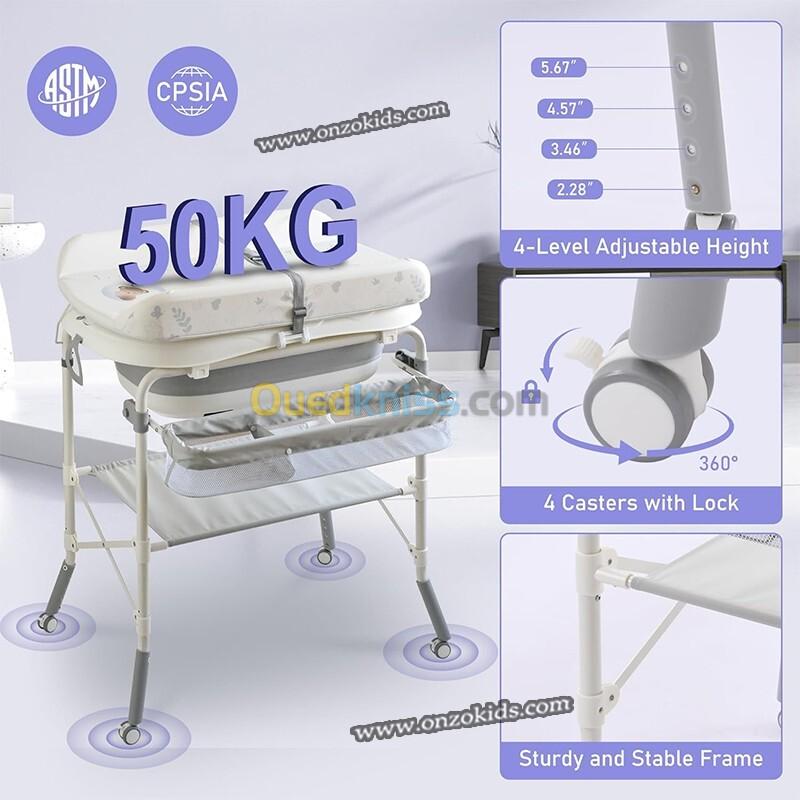 2 en 1 : Pratique et Confortable : Changez de couches et donnez le bain à votre bébé en toute simplicité et en toute sécurité. La table à langer est réglable en hauteur sur 4 niveaux pour soulager le dos des parents. Fabriquée avec des matériaux robustes et de haute qualité, elle garantit la sécurité de bébé.