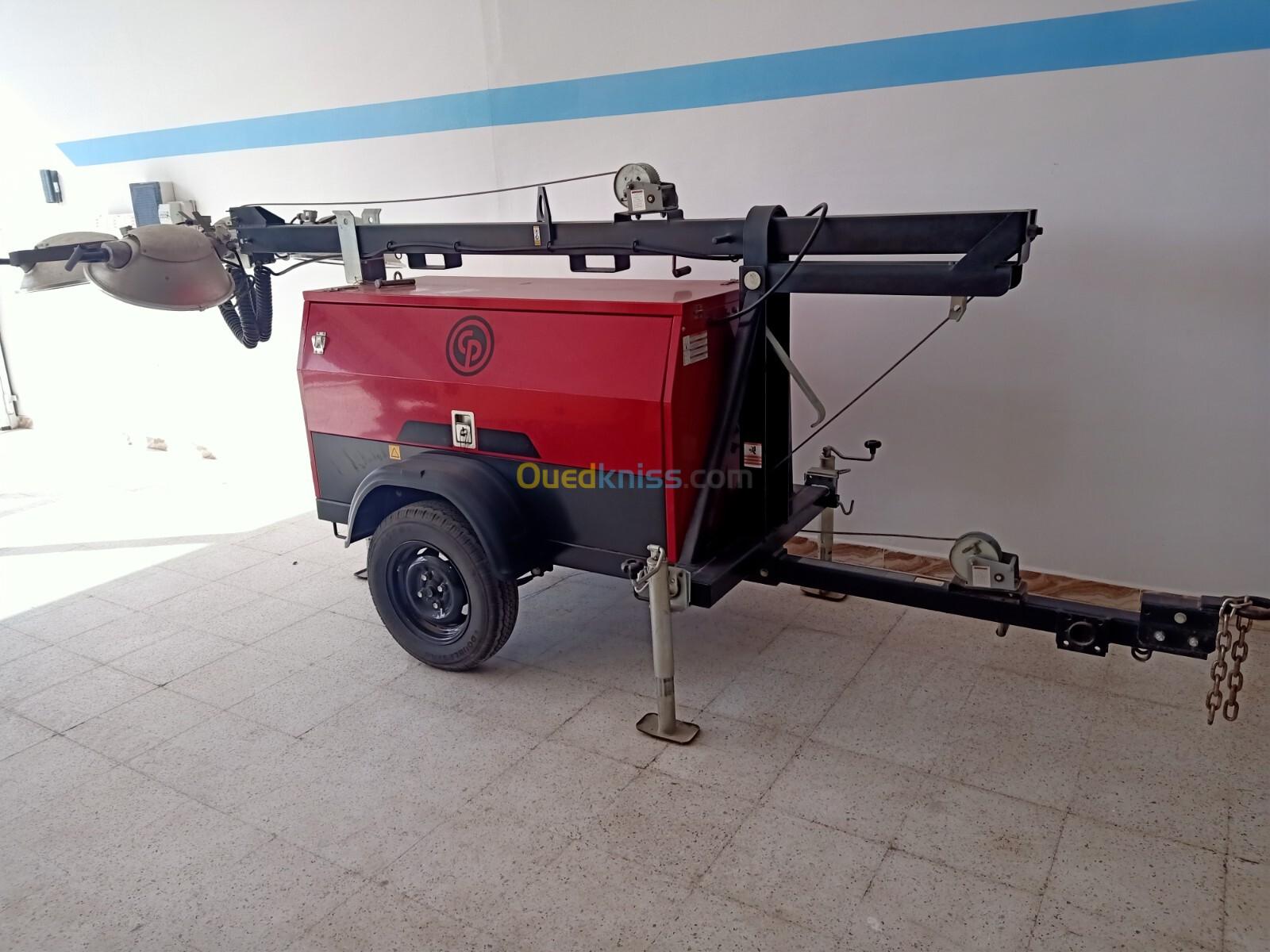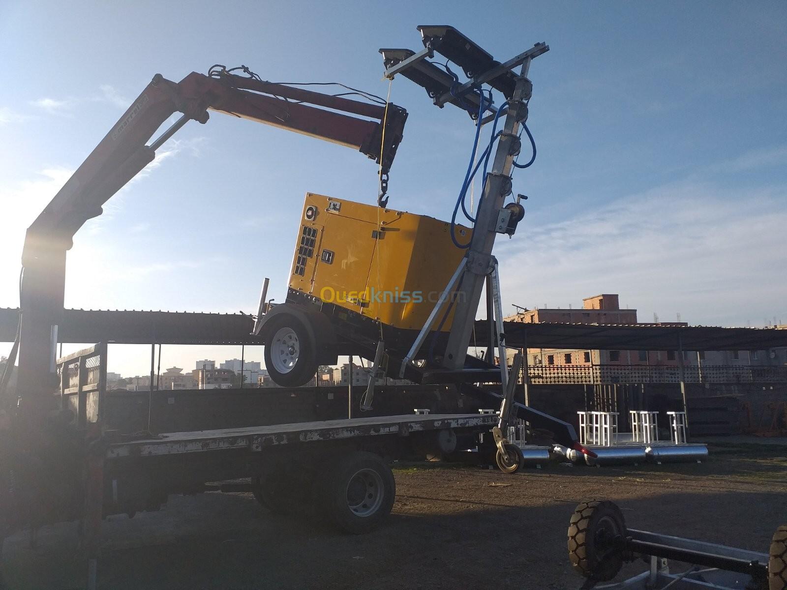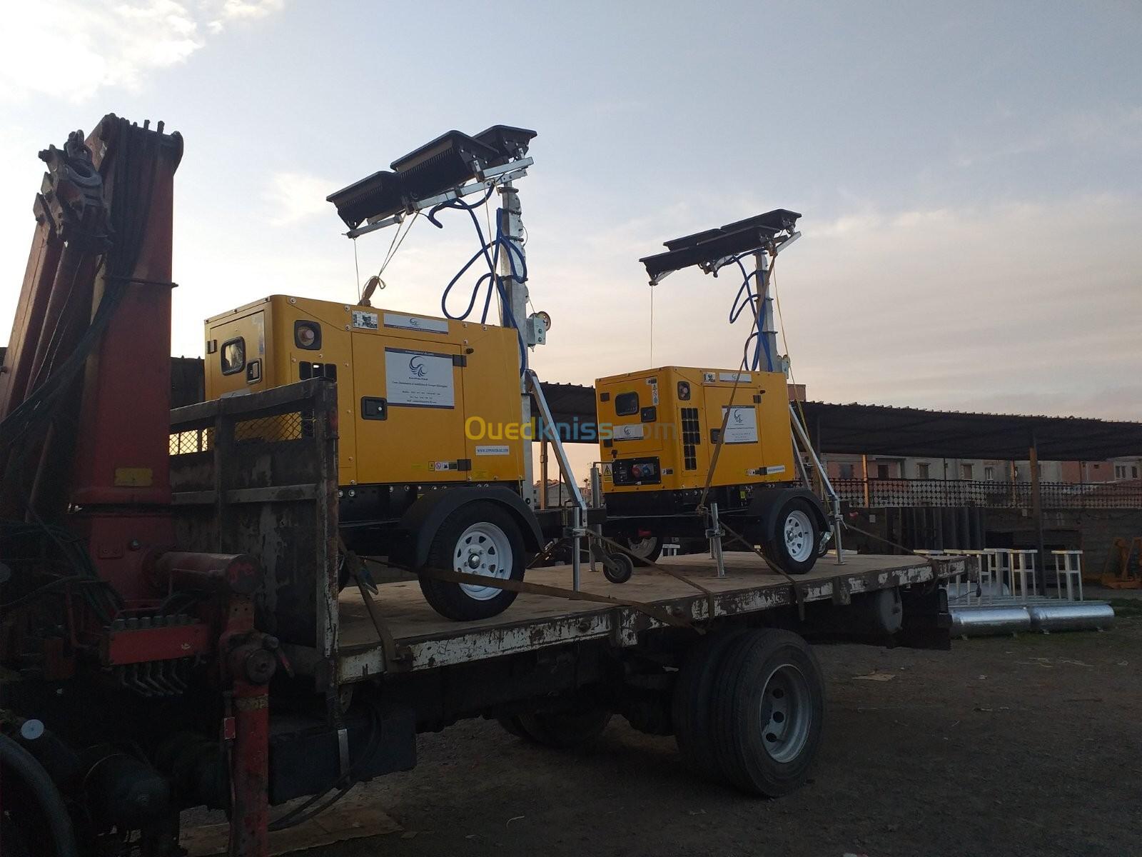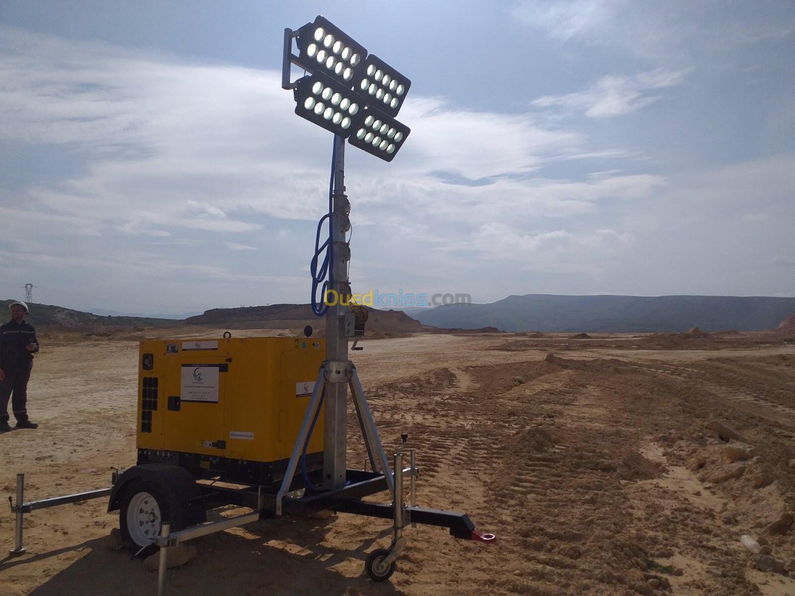 équipé d'une tour d'éclairage et d'un Groupe électrogènes diesel, 230/400V, 50Hz, Refroidissement à Eau, 1500Tr/Min, Groupe capoté, insonorisé, Moteur LOMBARDINI/KOHLER / KUBOTA/ AKSA / YANGDONG / SDMO(USA/Italie/ JAPAN/ FRANCE),